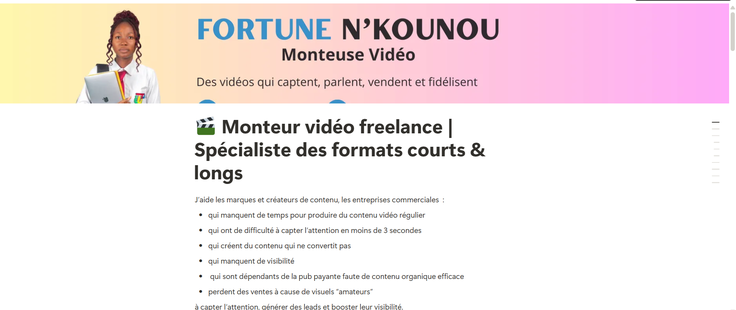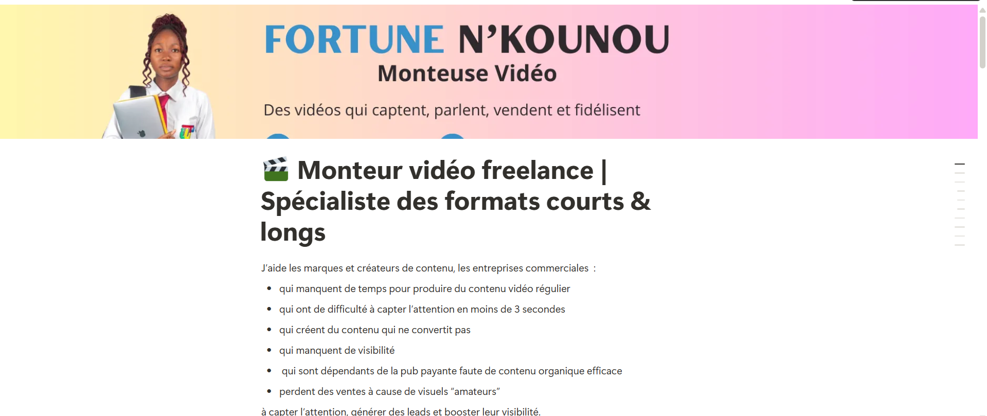 J'aide les marques , créateurs de contenus et les entreprises commerciales: 🎯qui manquent de temps pour produire du contenu vidéo régulier, 🎯qui ont de difficulté à capter l'attention en moins de 3 secondes, 🎯qui créent du contenu qui ne convertit pas, 🎯qui manquent de visibilité à capter l'attention , générer des leads et booster leur visibilité.