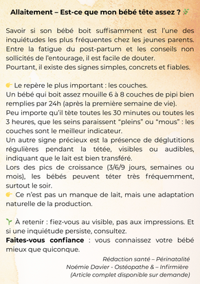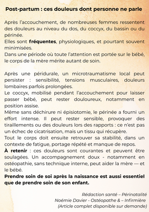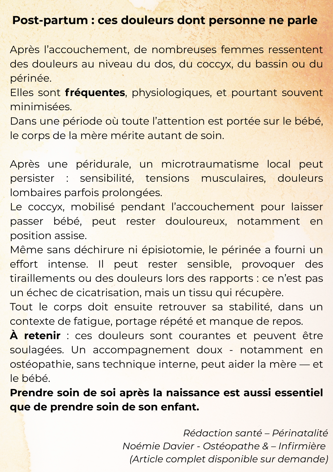 Je suis infirmière diplômée d’État et ostéopathe, spécialisée en périnatalité : allaitement, portage physiologique, développement du bébé, sommeil, douleurs post-partum, alimentation.