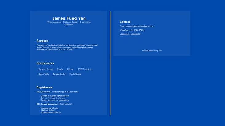 Je m'appelle James Fung, assistant virtuel freelance spécialisé dans le service client, l’assistance e-commerce et la gestion des tâches administratives à distance.