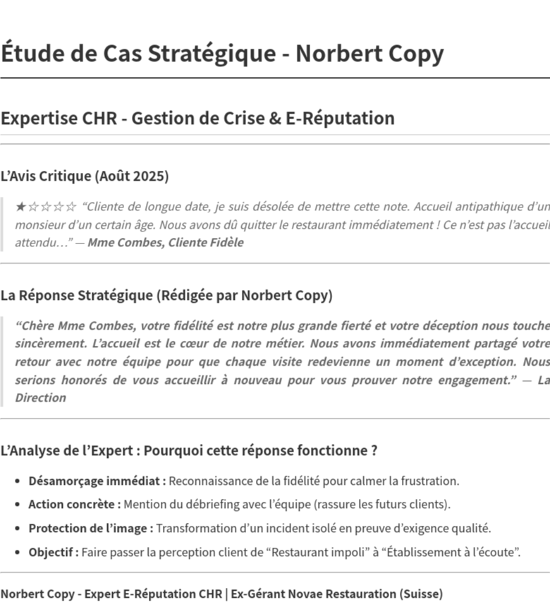 Réponses aux avis (sous 24h/48h) : Un ton professionnel, diplomate et vendeur.
