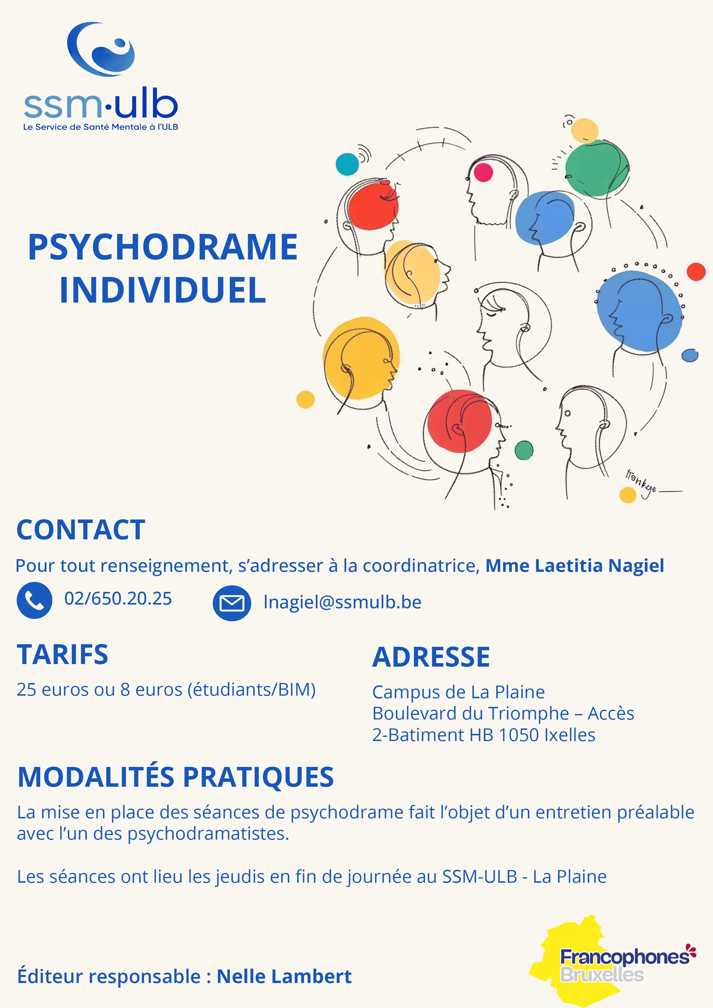 Ce flyer a été conçu pour promouvoir un service de santé mentale spécialisé dans les séances de psychodrame. Le design est sobre et apaisant, avec des couleurs douces et un visuel qui évoque la tranquillité et le bien-être. Le flyer présente clairement les informations essentielles : les détails des séances de psychodrame, qui sont une approche thérapeutique innovante pour explorer les émotions et les situations de la vie à travers le jeu de rôle. Les tarifs sont indiqués de manière transparente, offrant une gamme de prix selon les types de séances (individuelles, en groupe, ou pour des sessions spécifiques). Les informations de contact sont facilement visibles, avec un numéro de téléphone, un email et une adresse physique pour les rendez-vous.