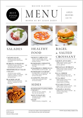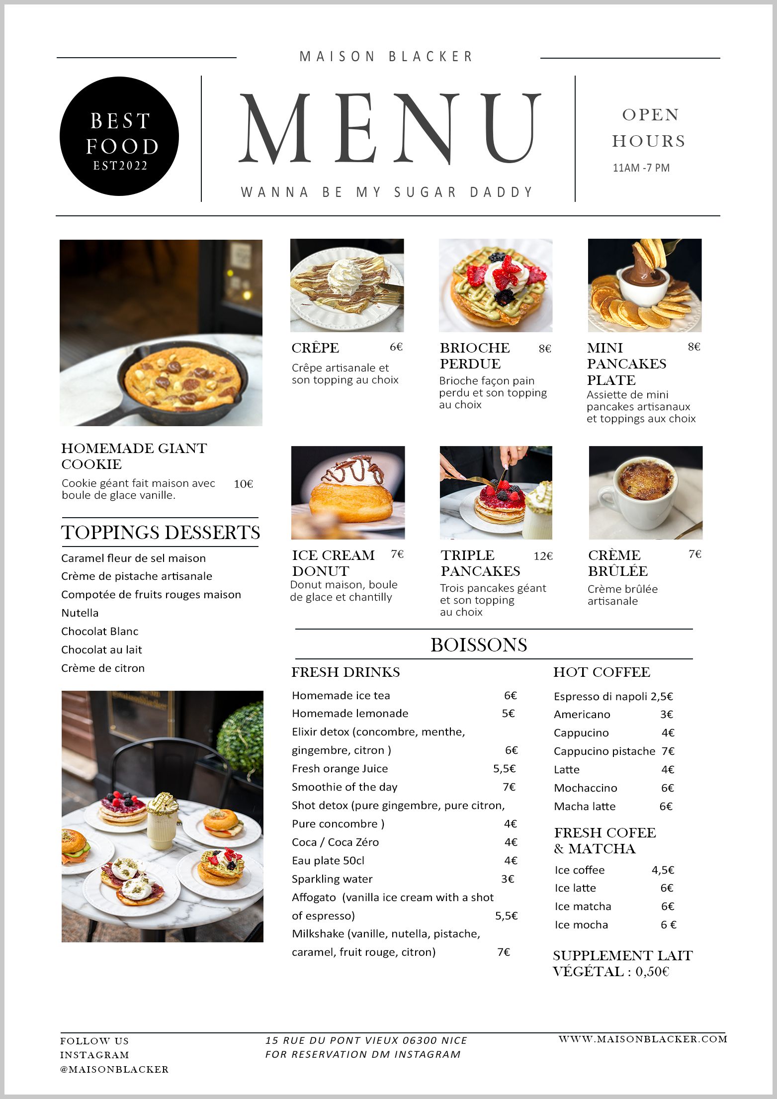 J'ai réalisé un design élégant et moderne pour le menu du restaurant Maison Blacker, en mettant l'accent sur une présentation visuelle claire et attrayante. Le choix des couleurs et des typographies reflète l'identité de l'établissement : une alliance entre tradition et modernité.