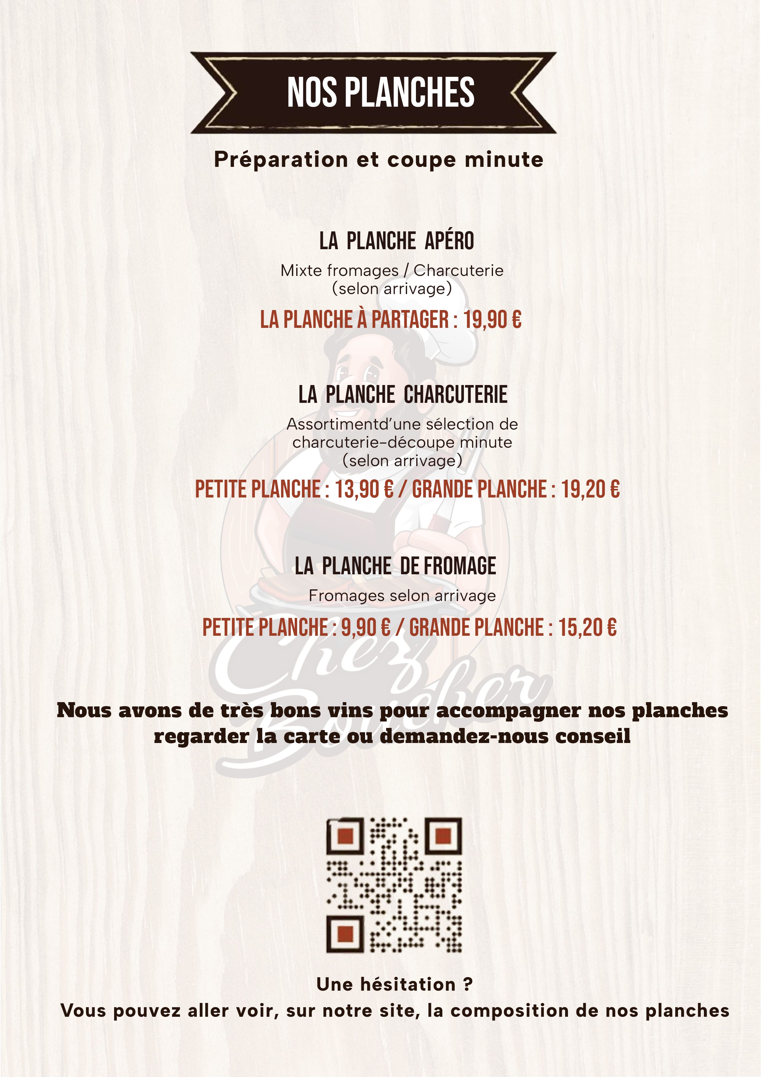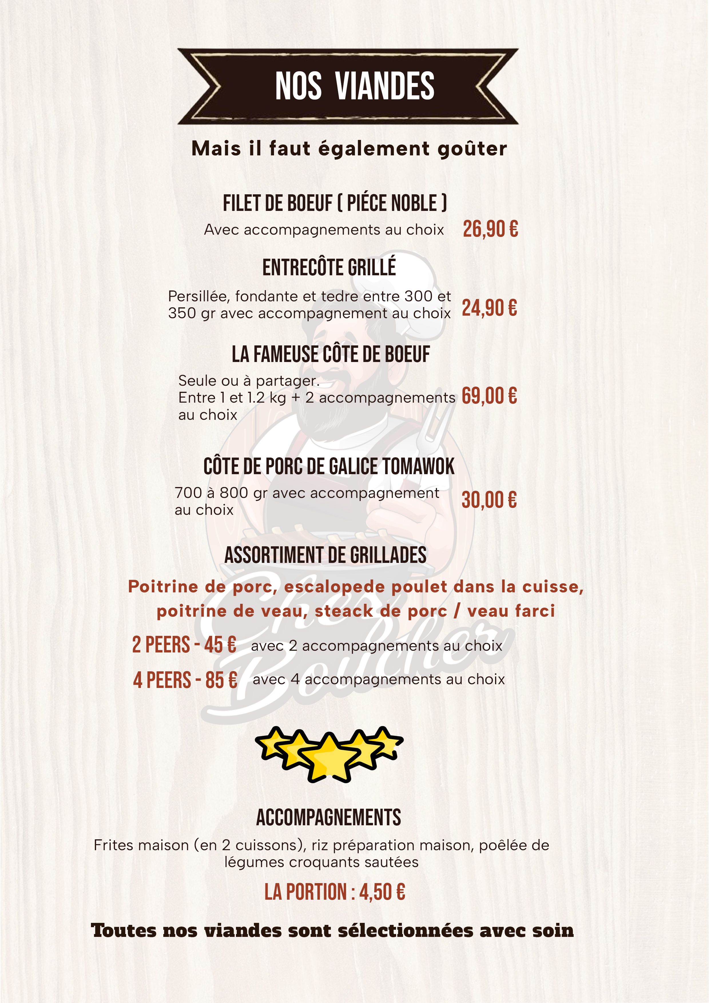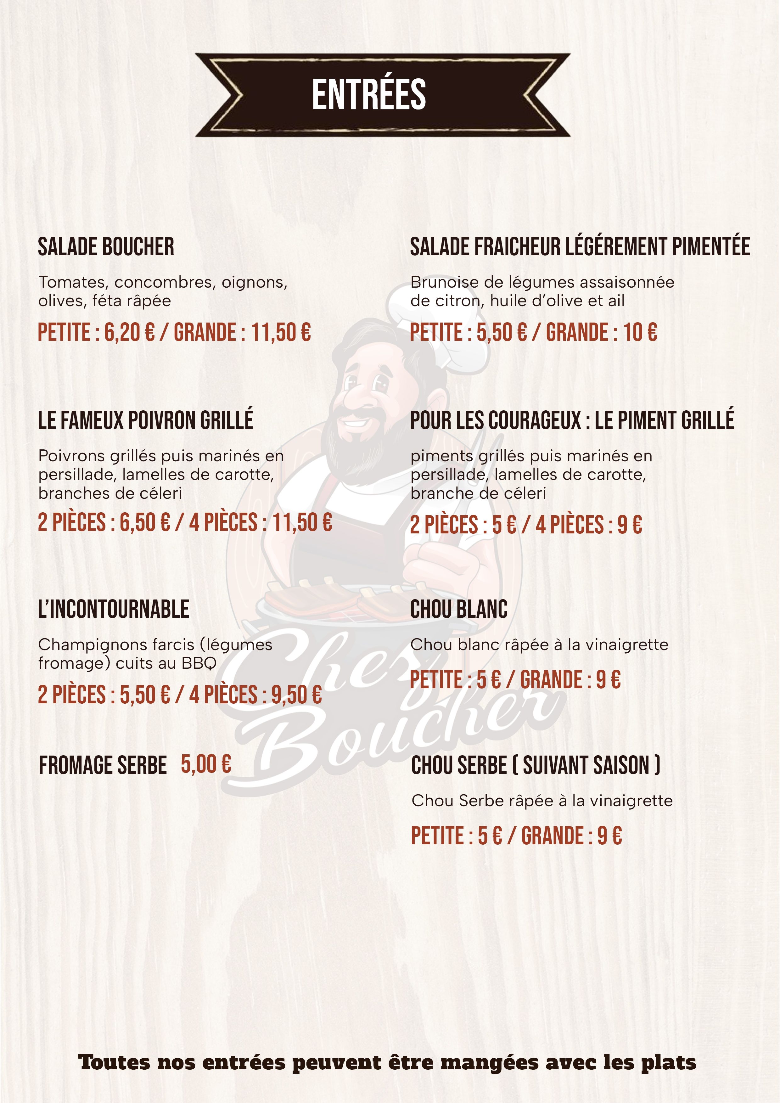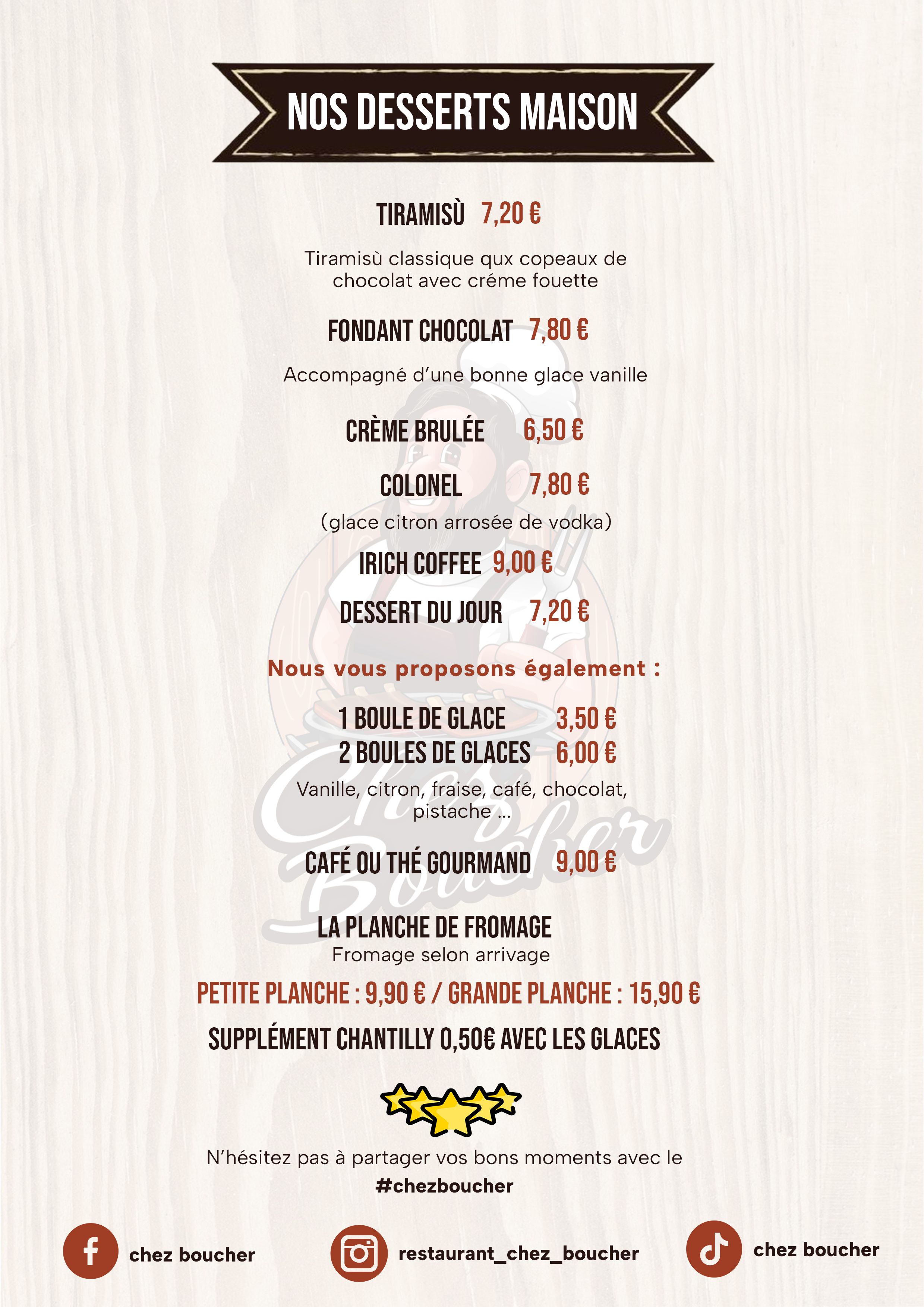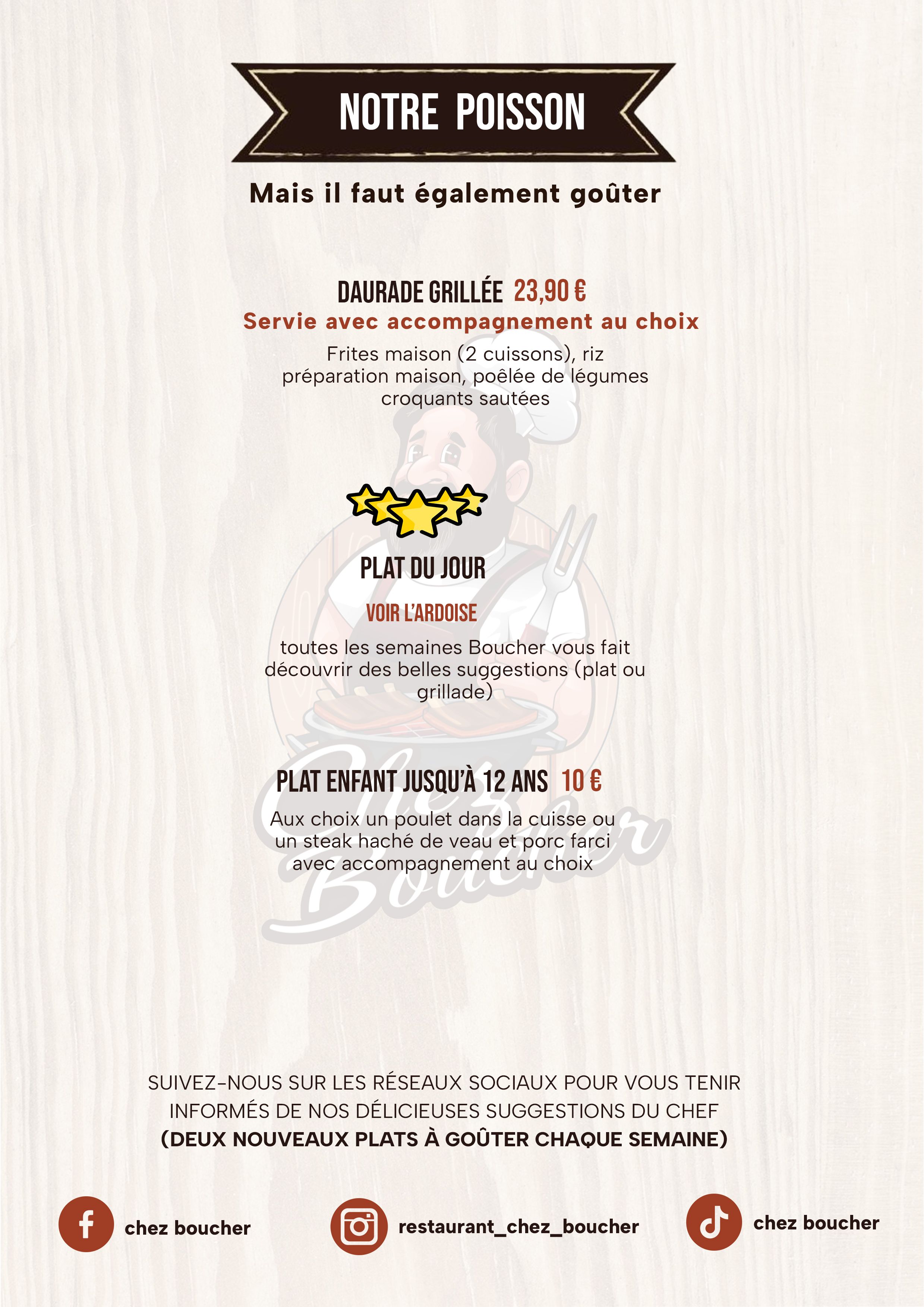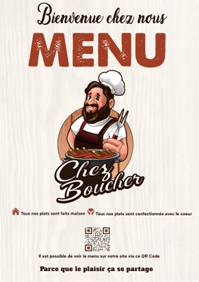 Le menu "Chez Boucher" a été conçu pour offrir une présentation soignée, à l'image de l'établissement, dans une ambiance conviviale et chaleureuse. Ce menu met en avant une sélection raffinée de plats, réalisés avec des ingrédients frais et locaux, dans le respect des traditions culinaires et de l'innovation. Les sections du menu sont bien structurées, avec une présentation claire des entrées, plats principaux, desserts, et boissons. Chaque plat est accompagné d'une description concise pour éveiller les sens des clients, soulignant les saveurs authentiques et l'excellence des produits.