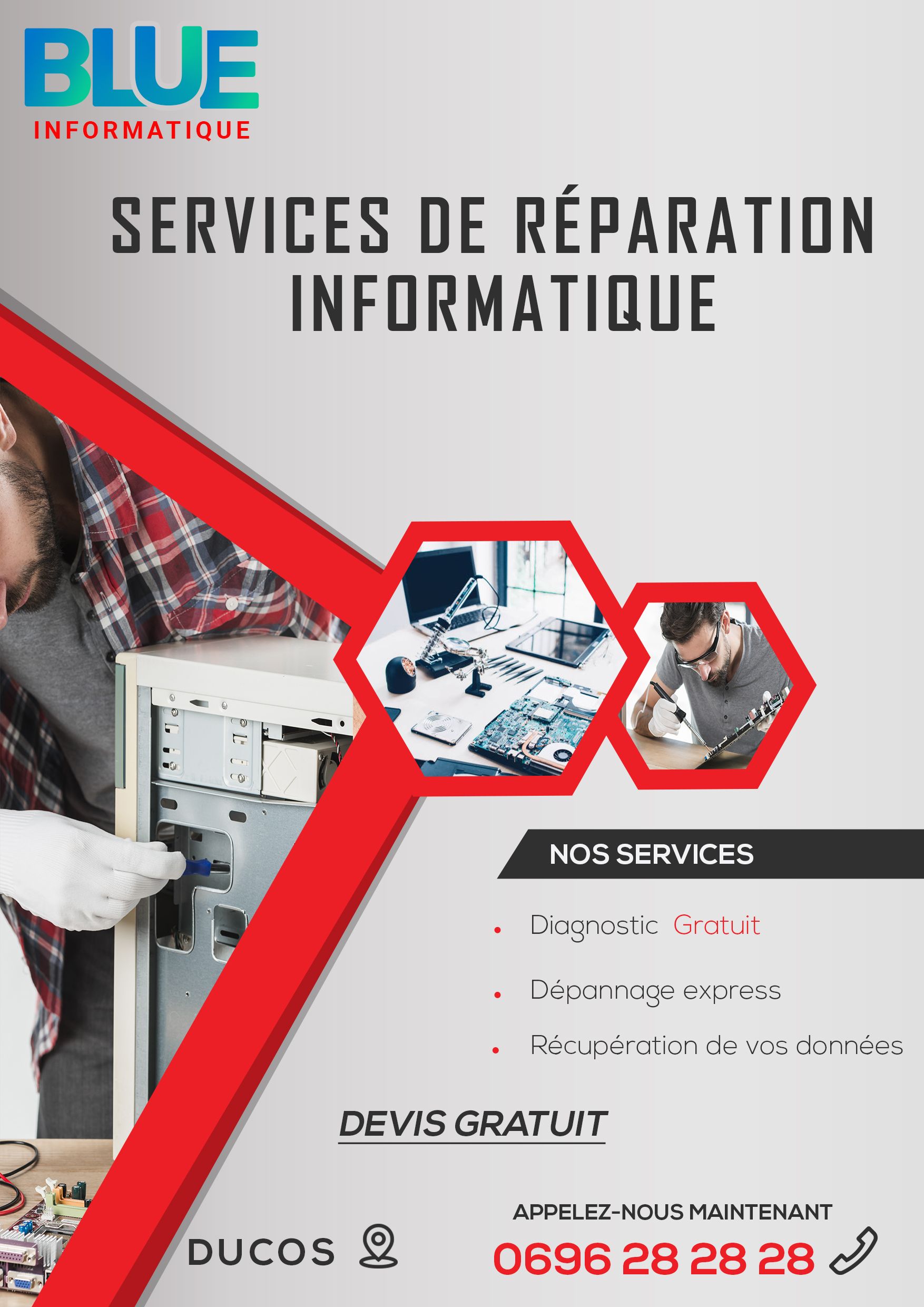 Ce projet consiste en la conception graphique d'une bannière et d'un flyer pour "Blue Informatique", une entreprise spécialisée dans les services de réparation informatique. L'objectif était de proposer une identité visuelle moderne, professionnelle et dynamique, tout en assurant une communication claire et efficace des services offerts.