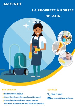 Création d’un flyer recto simple, clair et percutant pour présenter AMO’NET, une entreprise individuelle spécialisée dans le nettoyage et l’entretien des bâtiments. Le visuel met en avant la fiabilité, la réactivité et le professionnalisme des services offerts, tout en respectant une identité graphique propre et rassurante.