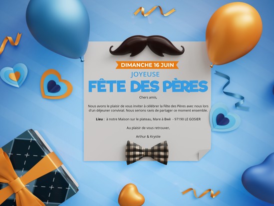 J'ai conçu une carte d'invitation élégante et moderne pour célébrer la Fête des Pères. Le design est inspiré par la force et la bienveillance des pères, avec des éléments visuels raffinés et un choix de couleurs masculines et chaleureuses. À l'intérieur, un message personnalisé invite les proches à se joindre à la célébration en l'honneur des pères, avec des mots qui expriment respect et gratitude. La carte est conçue pour transmettre un sentiment d'appréciation et de convivialité, tout en offrant une invitation simple et élégante pour un moment spécial à partager.