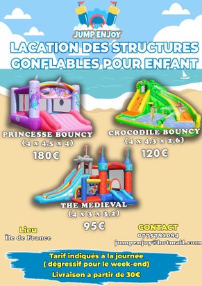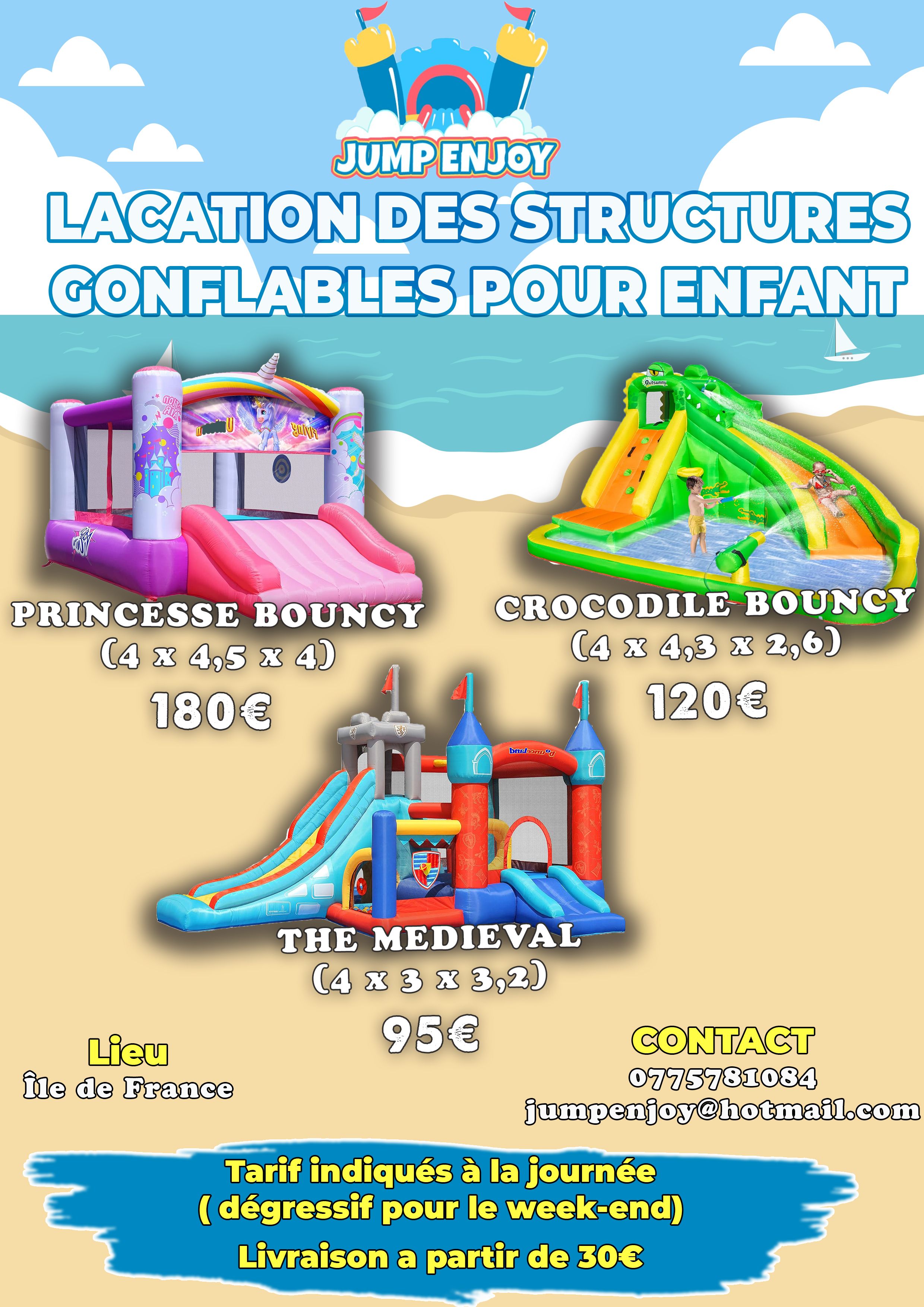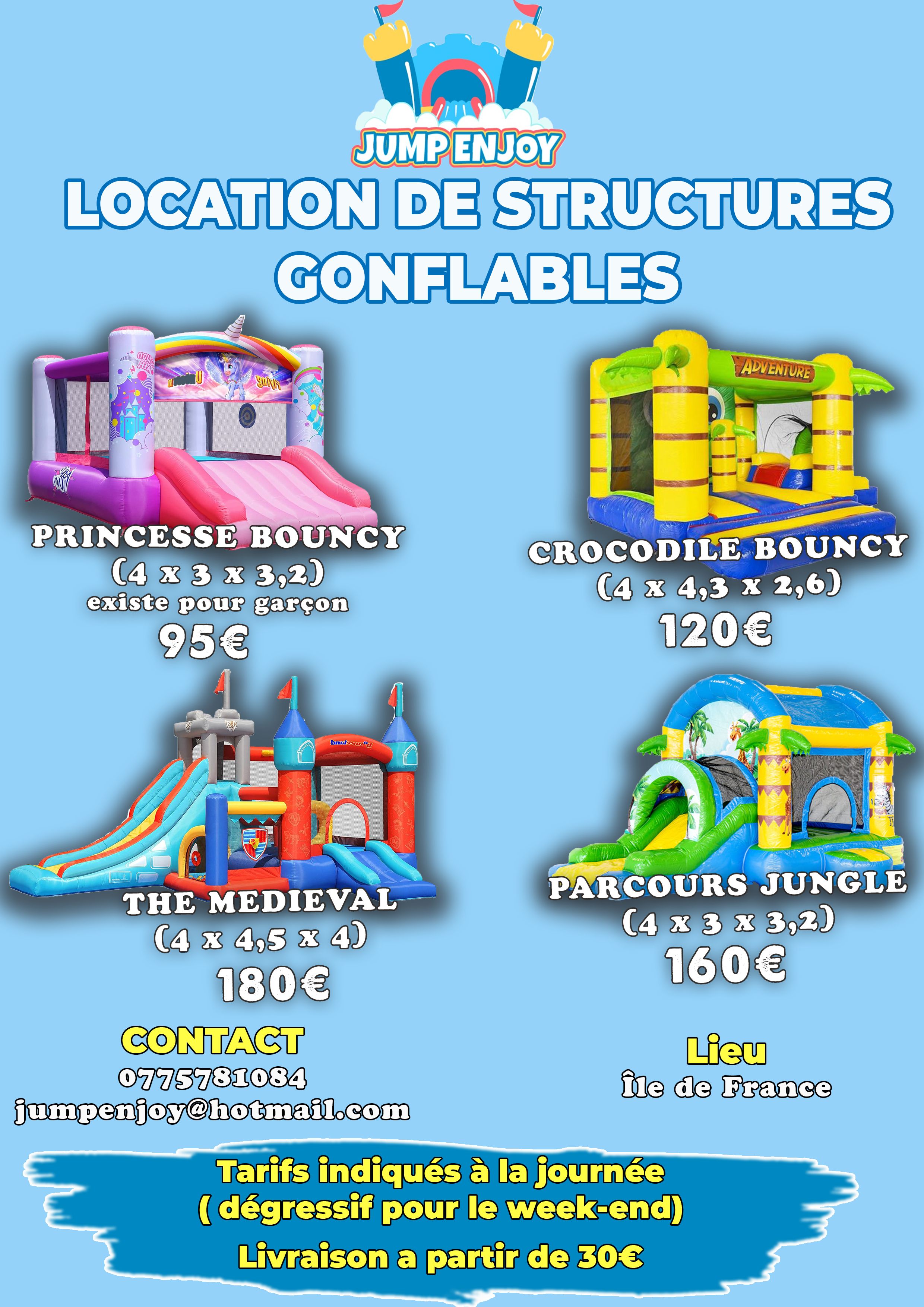 Réalisation d’un flyer coloré et attrayant pour promouvoir les services de location de structures gonflables destinées aux événements pour enfants, tels que les fêtes d'anniversaire, les kermesses, et les événements scolaires