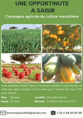 Ce flyer propose une opportunité d'investissement dans une campagne agricole de culture maraîchère au Sénégal