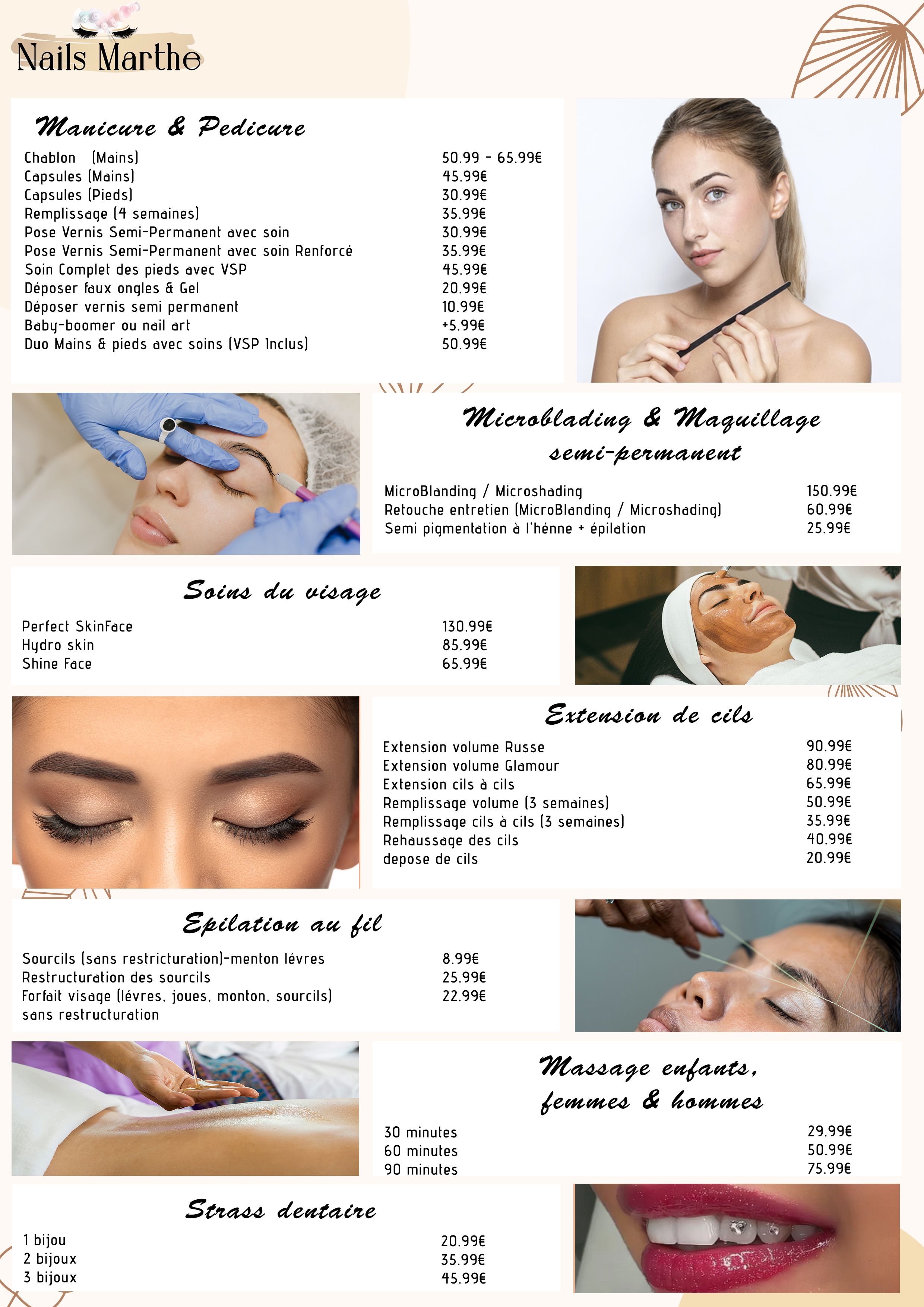 Ce flyer a été réalisé pour présenter les services et les tarifs d'un centre de beauté et d'esthétique. Il met en valeur une liste complète des prestations, telles que les soins du visage, les massages, la manucure, et les forfaits de mise en beauté. Le design épuré et élégant, avec une palette de couleurs douces et apaisantes, reflète l’ambiance relaxante du centre. Les tarifs sont clairement affichés pour permettre aux clients de choisir facilement les services adaptés à leurs besoins.