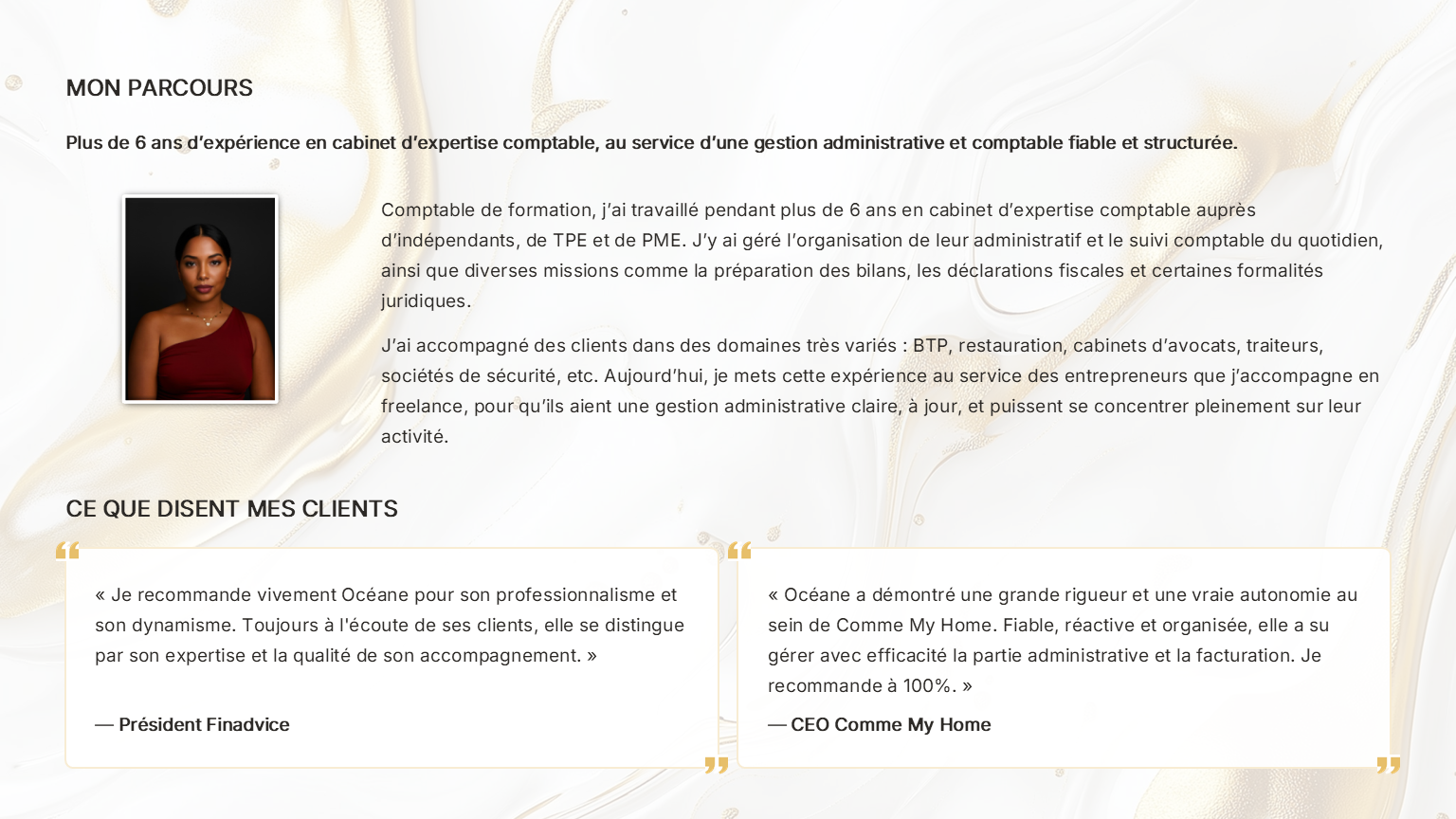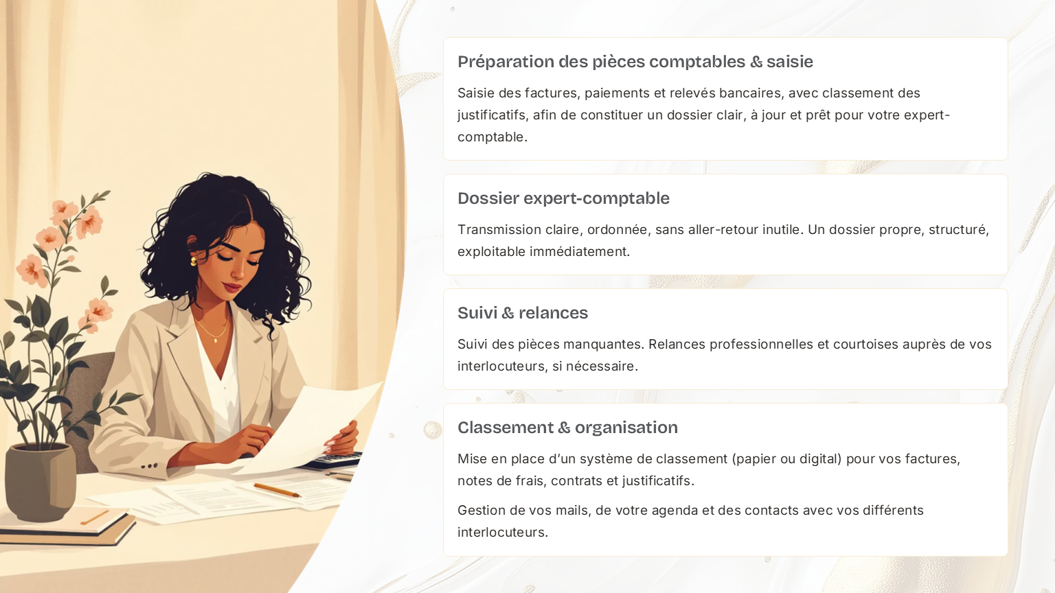 Comptable de formation, j’ai travaillé pendant plus de 6 ans en cabinet d’expertise comptable auprès d’indépendants, de TPE et de PME. J’y ai géré l’organisation de leur administratif et le suivi comptable du quotidien, ainsi que diverses missions comme la préparation des bilans, les déclarations fiscales et certaines formalités juridiques. J’ai accompagné des clients dans des domaines très variés : BTP, restauration, cabinets d’avocats, traiteurs, sociétés de sécurité, etc. Aujourd’hui, je mets cette expérience au service des entrepreneurs que j’accompagne en freelance, pour qu’ils aient une gestion administrative claire, à jour, et puissent se concentrer pleinement sur leur activité.
