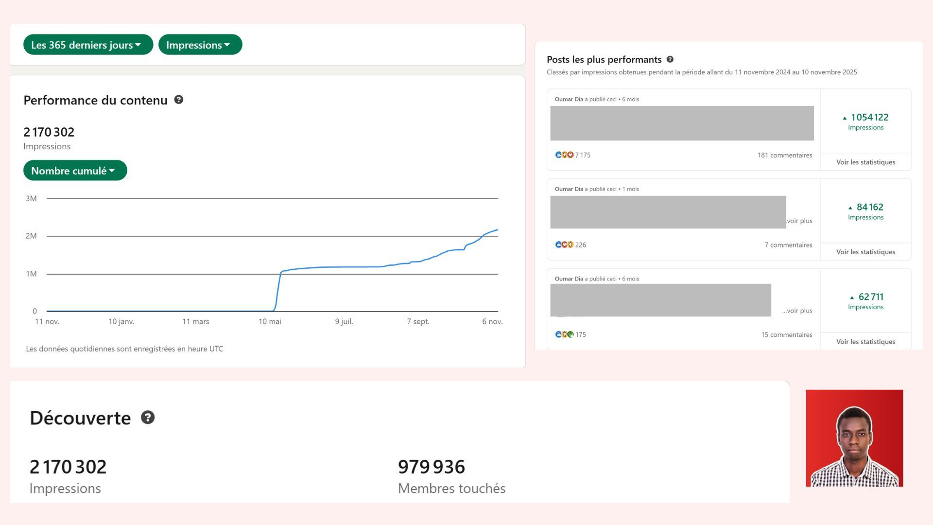 💡 Qui je suis Je gère aujourd’hui un compte LinkedIn de +3 900 abonnés construit en moins de 3 mois, avec des posts qui dépassent régulièrement les 50 000 à 100 000 impressions.