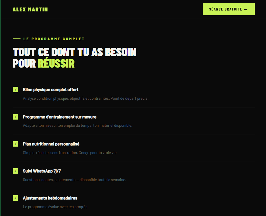 Création de landing pages sur mesure en HTML/CSS pour coachs sportifs. Design, copywriting, SEO et intégration de paiement inclus. Livraison en 24h, zéro template utilisé.