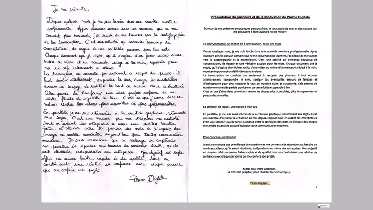 Je suis micro-entrepreneure spécialisée en dactylographie et en création graphique. Mon objectif : vous fournir des documents clairs, précis et professionnels, que ce soit pour la retranscription de vos fichiers audio, vidéos ou manuscrits, ou pour la création d’un logo unique et moderne qui reflète votre identité.