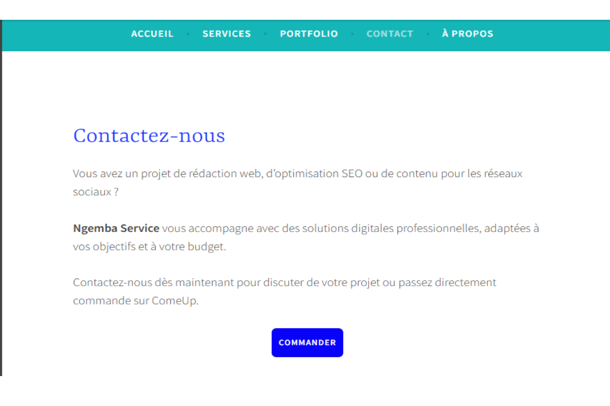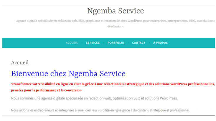 Au sein de Ngemba Service, je rédige des articles optimisés SEO, corrige et améliore des contenus web. J’interviens également dans la mise en page et la création de visuels simples pour des supports de communication professionnels.