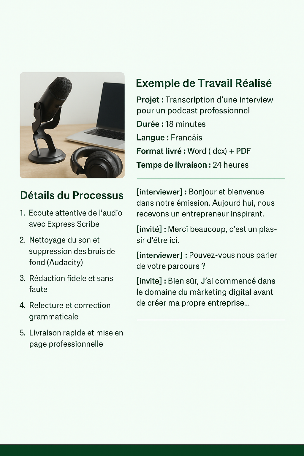 J’ai plus d’1 an d’expérience dans la transcription audio et vidéo de contenus variés : interviews, réunions, podcasts et vidéos YouTube. J’ai déjà travaillé pour des entrepreneurs, étudiants et créateurs de contenu