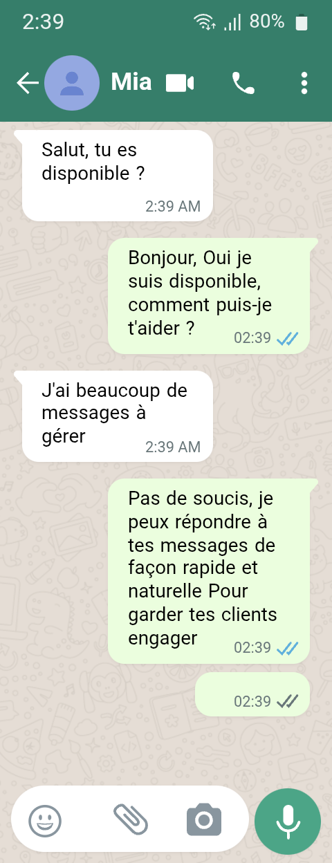 ✔ Réponses rapides et naturelles ✔ Adaptation à ton style ✔ Discrétion et professionnalisme