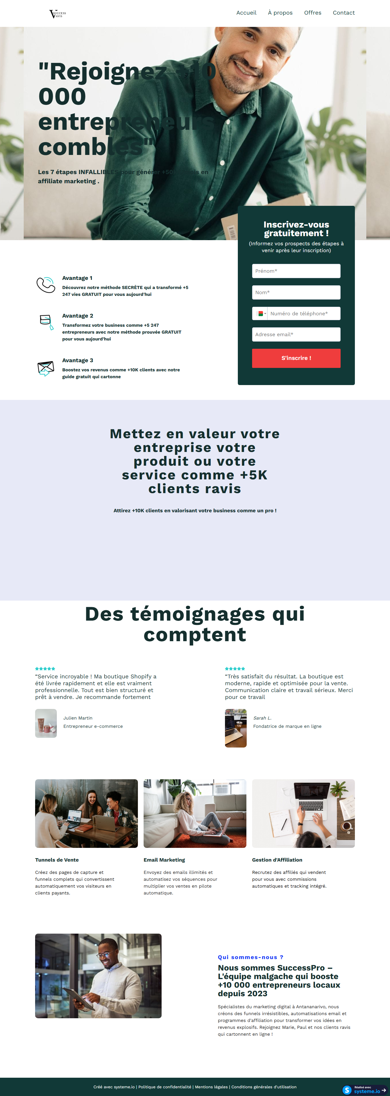 Création complète de boutiques Shopify prêtes à vendre (thème, produits, paiements). Tunnels de vente automatisés Systeme.io (capture email + séquences). Sites WordPress pros pour PME. Optimisation conversion + SEO de base.