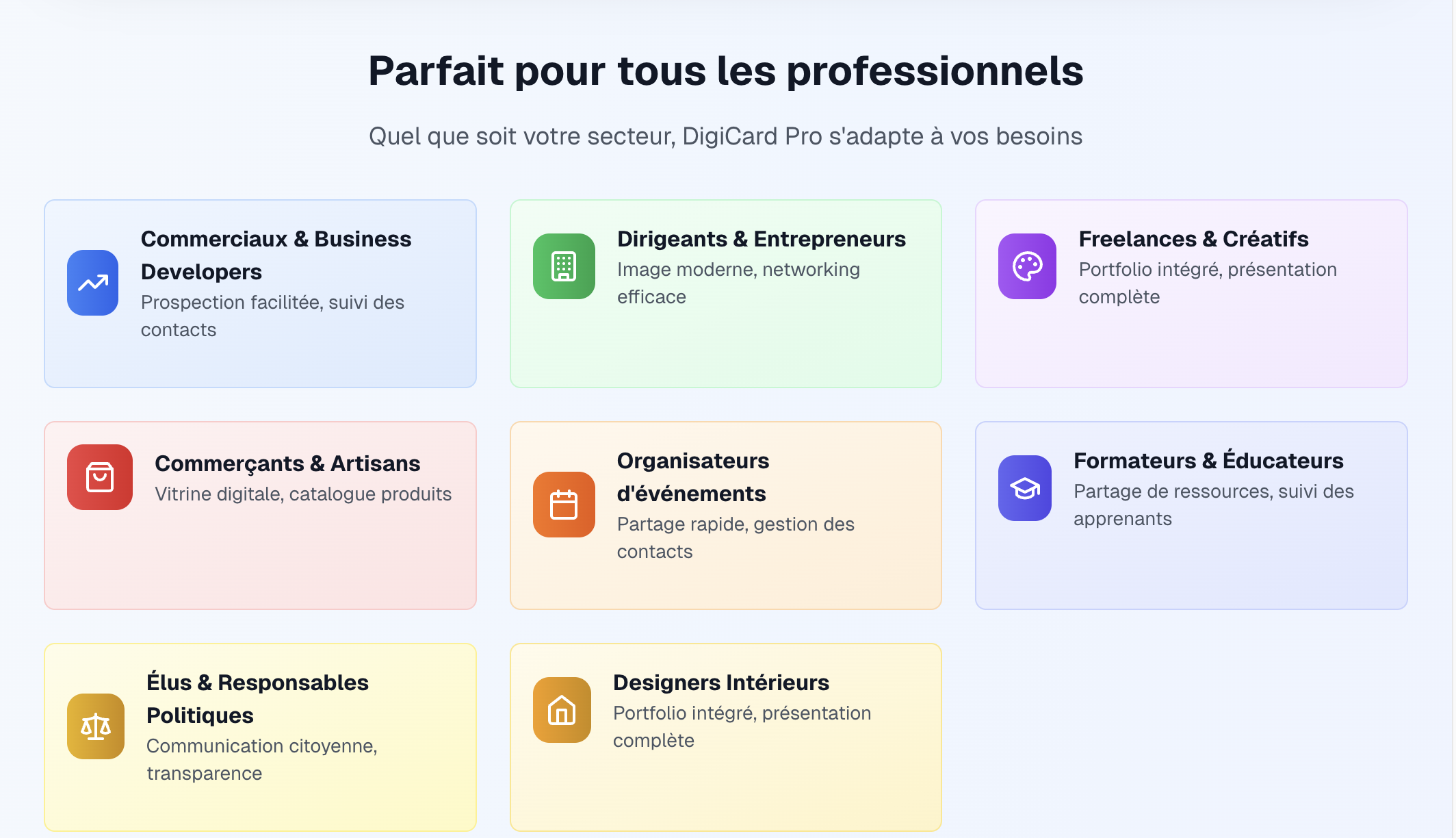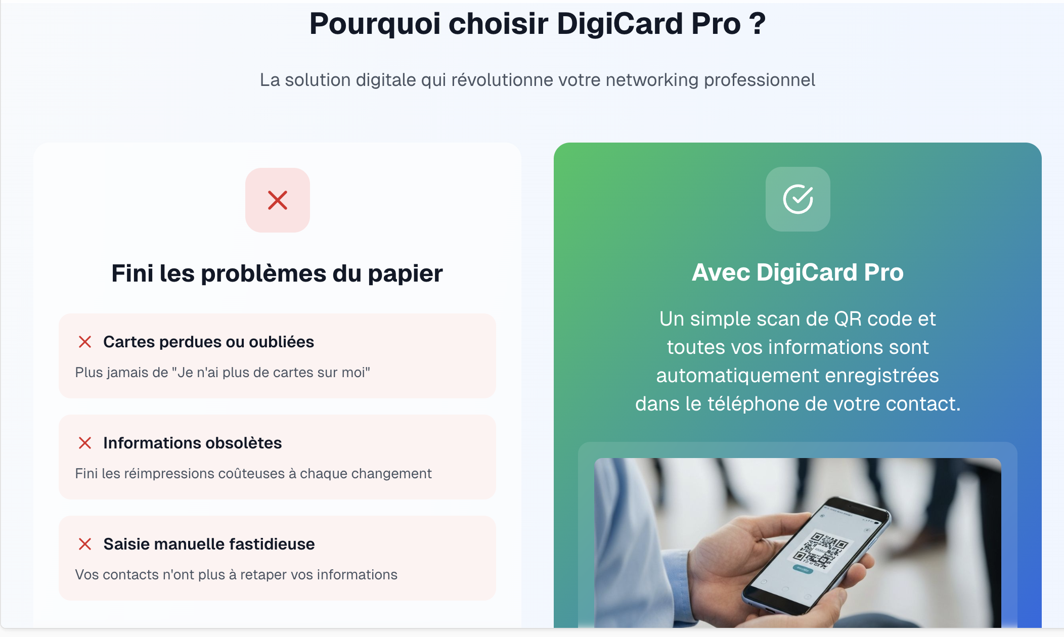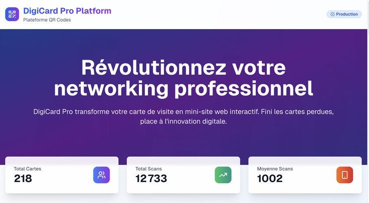 Cartes de visite digitales Premium DigiCard avec QR Code personnalisé Mini-site intégré (présentation, services, portfolios, etc.) Boutons d’action (appel, WhatsApp, email, réseaux sociaux) Showrooms digitaux et vitrines produits Captation de leads (nom, email, téléphone…) Automatisations pour prospection & prise de rendez-vous