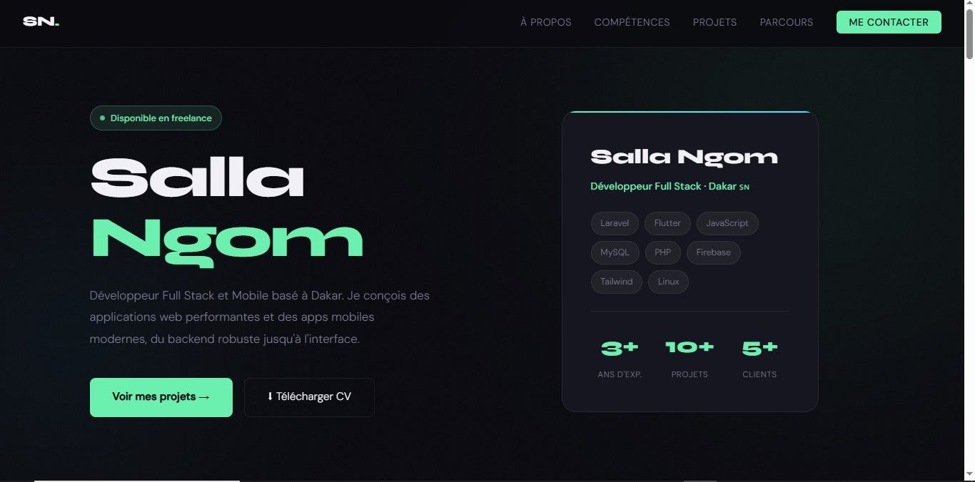 Développeur Full Stack & Mobile basé à Dakar, je conçois des sites web professionnels, des applications Laravel/PHP et des apps mobiles Flutter. Titulaire d'un Bac+3 en développement web (Université de Bambey) et certifié en Flutter (Xarala Academy) et Marketing Digital (Mastercard Foundation). Anciennement Conseiller Digital chez Orange, je sais aussi bien coder que communiquer avec les clients. Disponible pour vos projets freelance, je livre un travail propre, dans les délais.