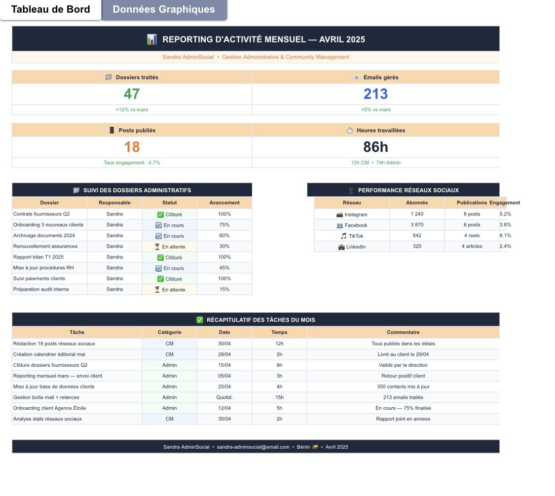 Sandra AdminSocial, Experte en gestion administrative et community management. Je structure votre gestion administrative et booste votre présence sur les réseaux sociaux. Forte d’une expérience en Middle Office au sein de groupes multi-entités, j’accompagne les entrepreneurs et PME francophones à distance. Ce que je fais pour vous : ∙ Reporting et tableaux de bord (Excel, Google Sheets, Notion) ∙ Coordination et suivi administratif ∙ Gestion de vos réseaux sociaux (LinkedIn, Facebook, TikTok) ∙ Création de calendriers éditoriaux Basée au Bénin, je travaille avec des clients partout dans le monde francophone.