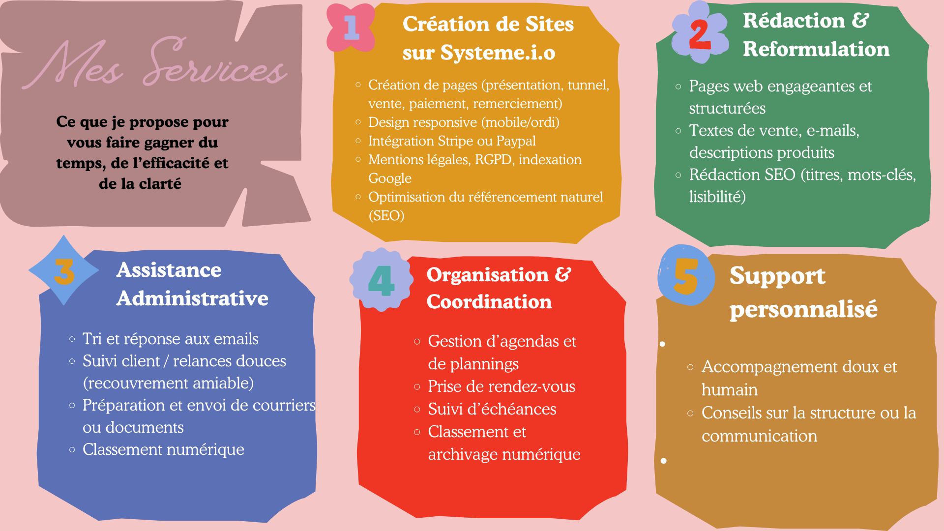 Parallèlement à mes missions administratives, j’ai également conçu mon propre site internet de A à Z. Cette expérience m’a conduite à accompagner d’autres professionnels dans la création de leur site, la rédaction de leurs contenus et leur organisation digitale.