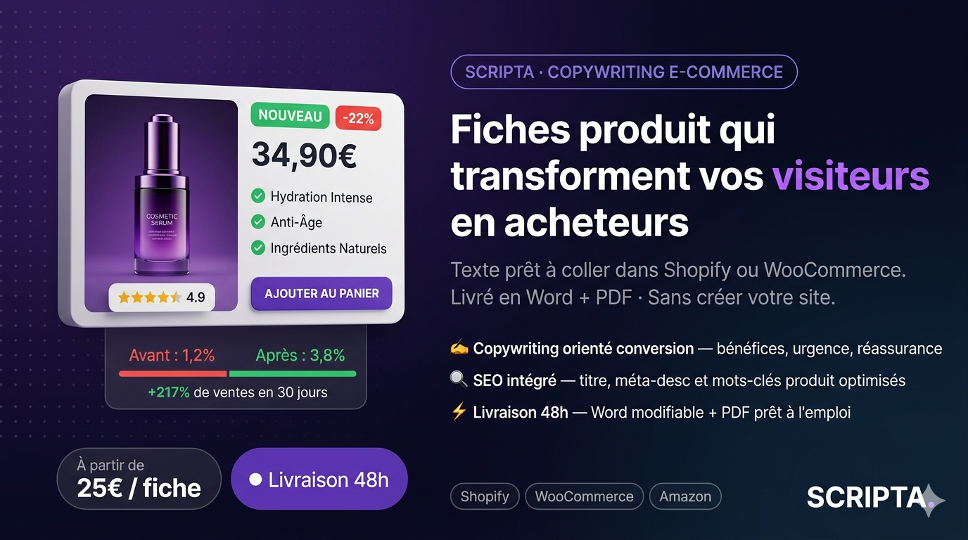✅ CV + Lettre de motivation optimisés ATS — Décrochez 3x plus d'entretiens ✅ Articles de blog SEO — Doublez votre trafic organique en 90 jours ✅ Fiches produits e-commerce — Transformez vos visiteurs en acheteurs ✅ Posts LinkedIn — Développez votre audience et votre personal branding ✅ Pages de vente & copywriting — Augmentez vos conversions ✅ Newsletters & séquences email — Fidélisez et vendez en automatique