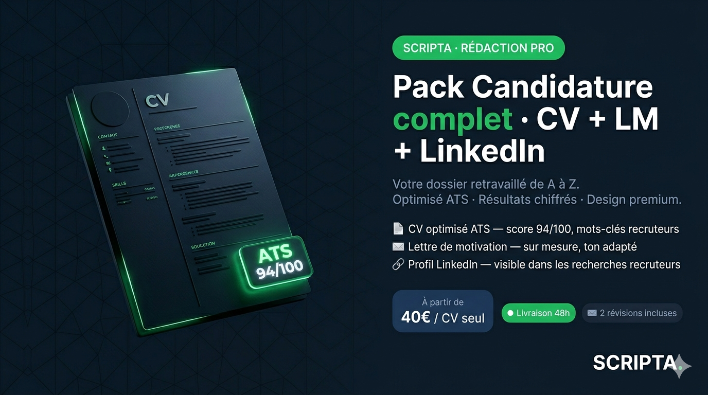 Ce qui fait la différence avec Scripta : — Chaque texte est rédigé sur mesure, jamais générique — Les résultats sont mesurables : score ATS, trafic SEO, taux de conversion — 2 révisions incluses dans chaque commande — Réponse sous 2h, livraison en 48h à 5 jours selon le service