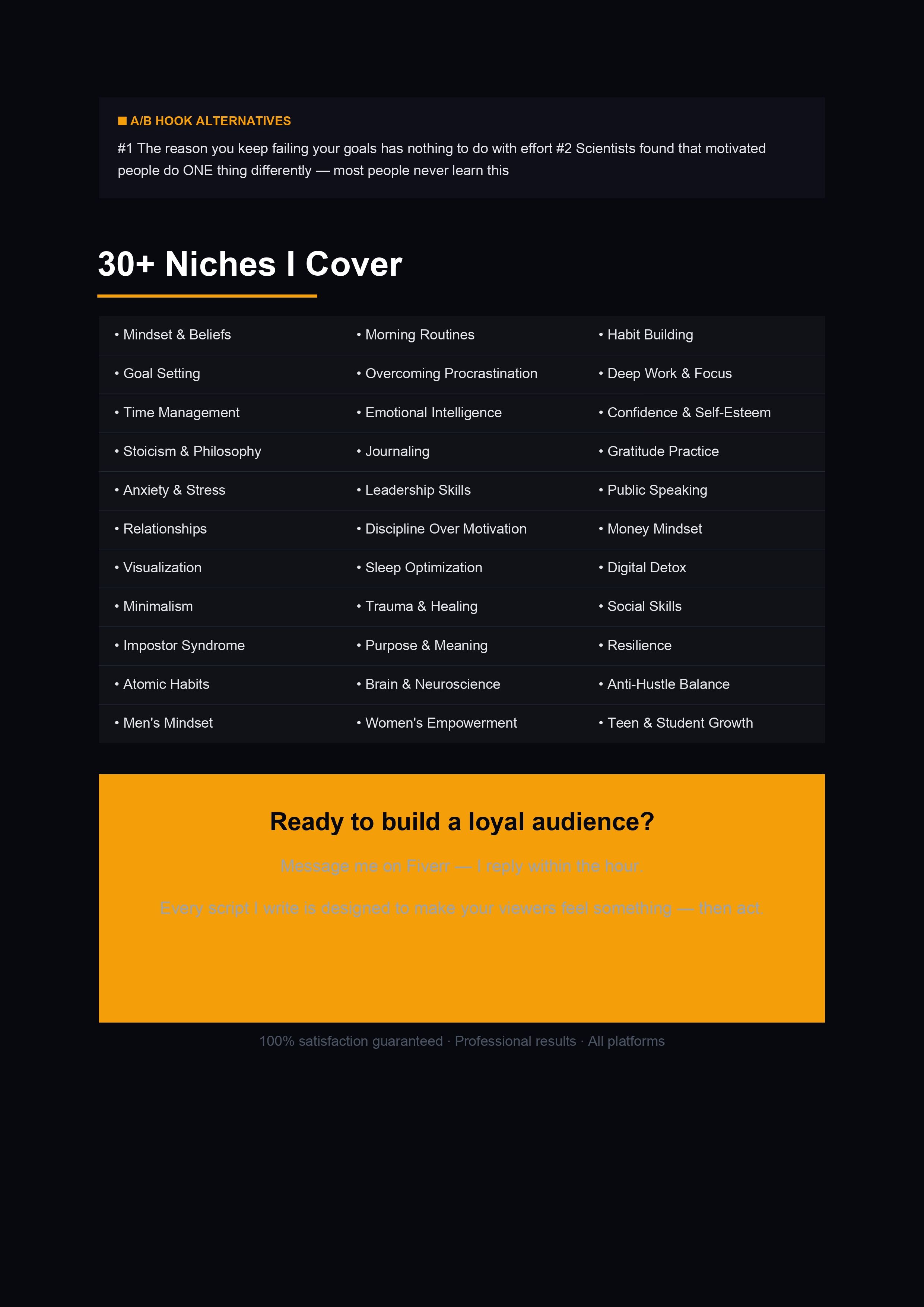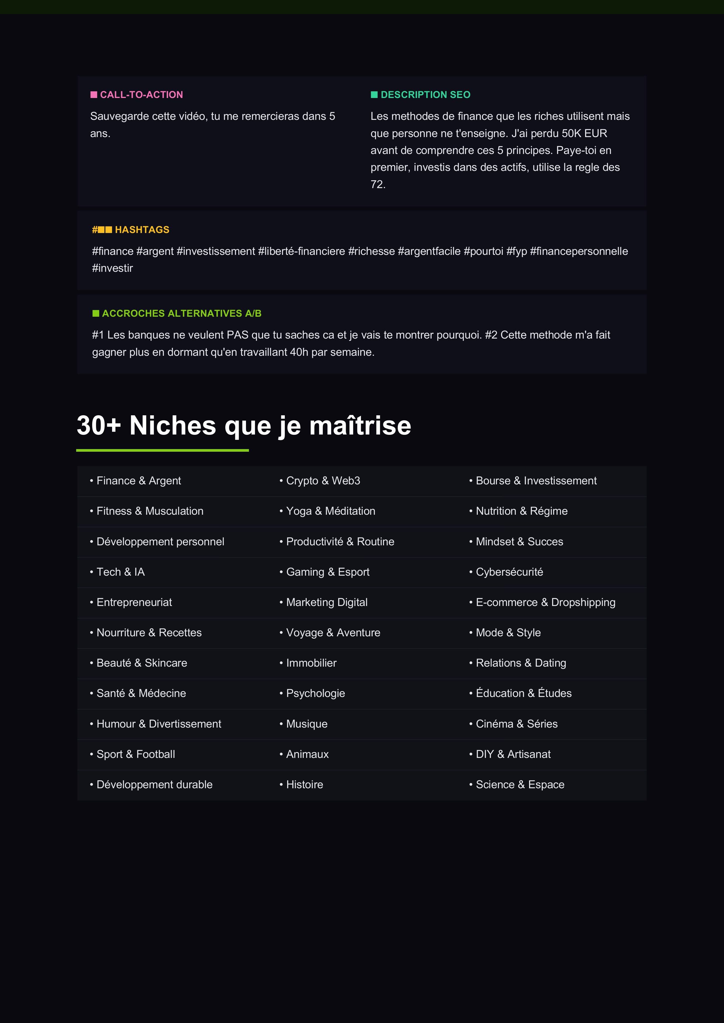 Niches (30+) Finance, fitness, tech, voyage, beauté, business, mindset… et plus (tu me donnes ta niche, je m’adapte).