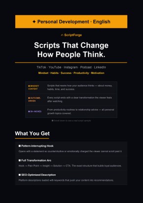 Ce que tu reçois (comme dans l’exemple) ✅ Hook “scroll-stopping” (les 3 premières secondes décident de tout) ✅ Structure complète + timing : Hook → Intro → Main → CTA ✅ CTA calibré conversion (abonnement/DM/lien/commentaire) ✅ Description SEO optimisée (YouTube & plateformes) ✅ Hashtags viraux ciblés (par niche + plateforme) ✅ Hooks alternatifs A/B (2–3) pour tester et exploser les perfs ✅ Chapitres YouTube avec timecodes (si contenu long)