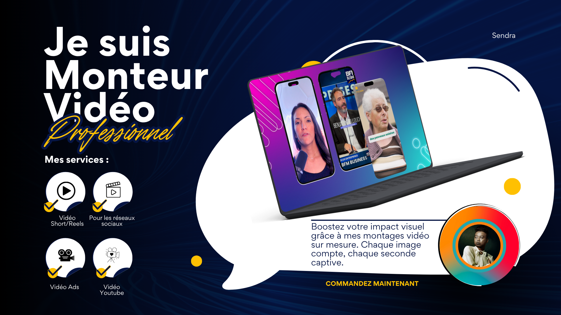 Sendra Randrianasolo, monteur vidéo et motion designer. Expert en vidéos TikTok, publicités, Instagram, Facebook et YouTube. Polyvalent, avec une expérience variée dans le fitness, la maroquinerie, la construction, le commerce, l'esthétique et la médecine.