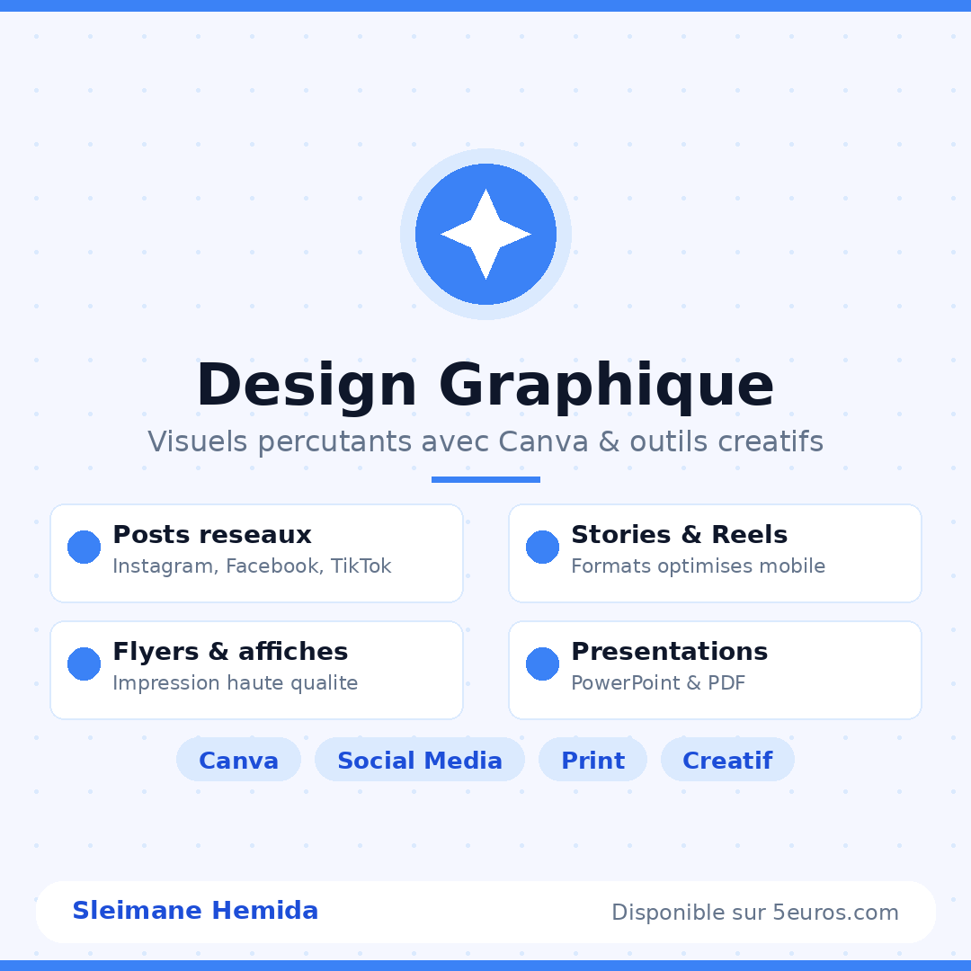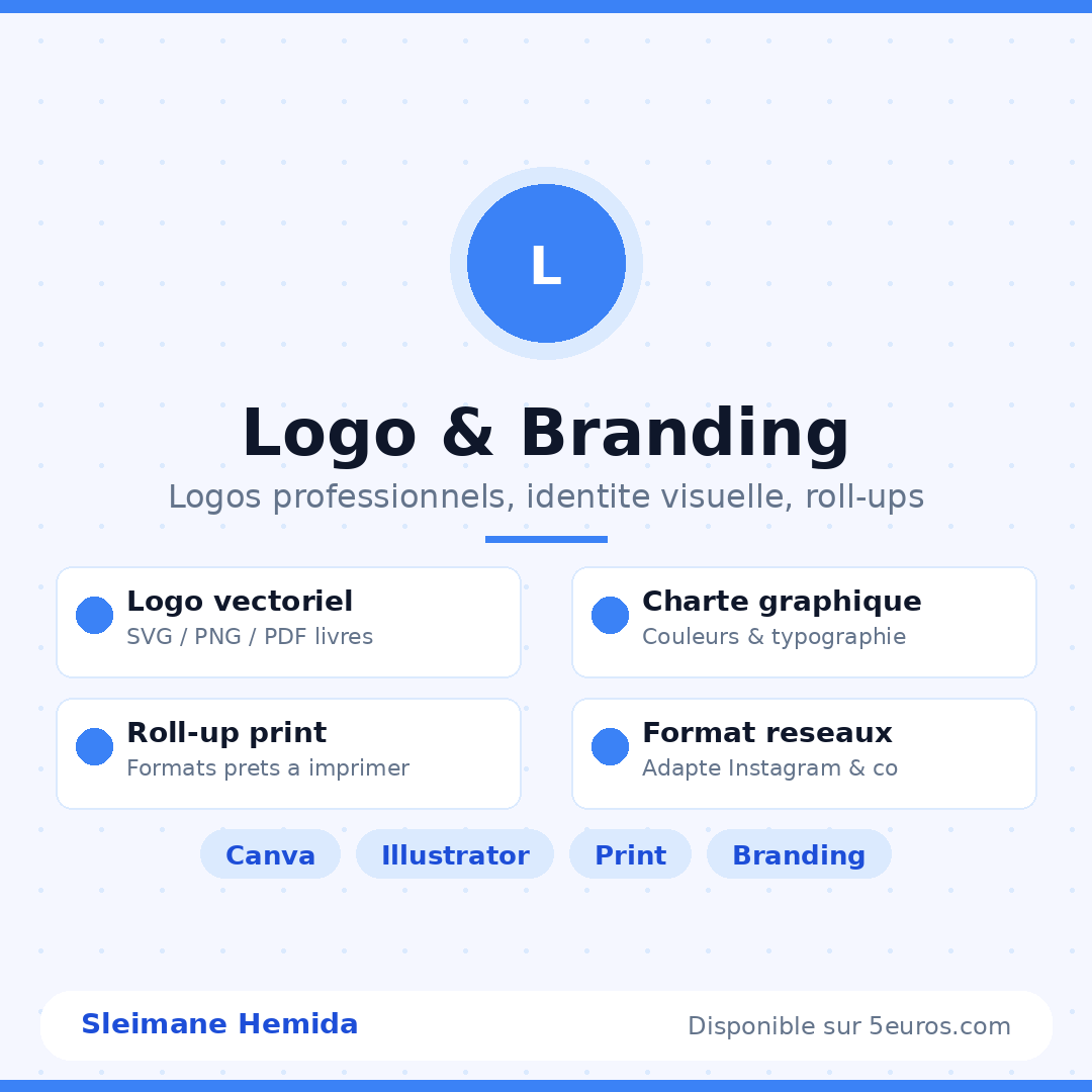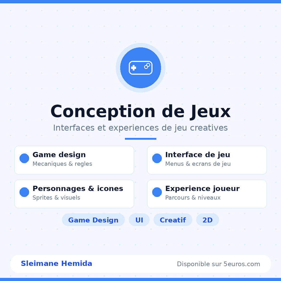 Bonjour ! Je suis un créatif polyvalent spécialisé en design graphique, développement web et création de contenu. Je conçois des logos, des roll-ups, des interfaces UI/UX, des sites web, et je propose également des services de rédaction. Que vous soyez une petite entreprise, un entrepreneur ou un particulier, je m'engage à vous livrer un travail soigné, dans les délais et à votre image. N'hésitez pas à me contacter pour discuter de votre projet !