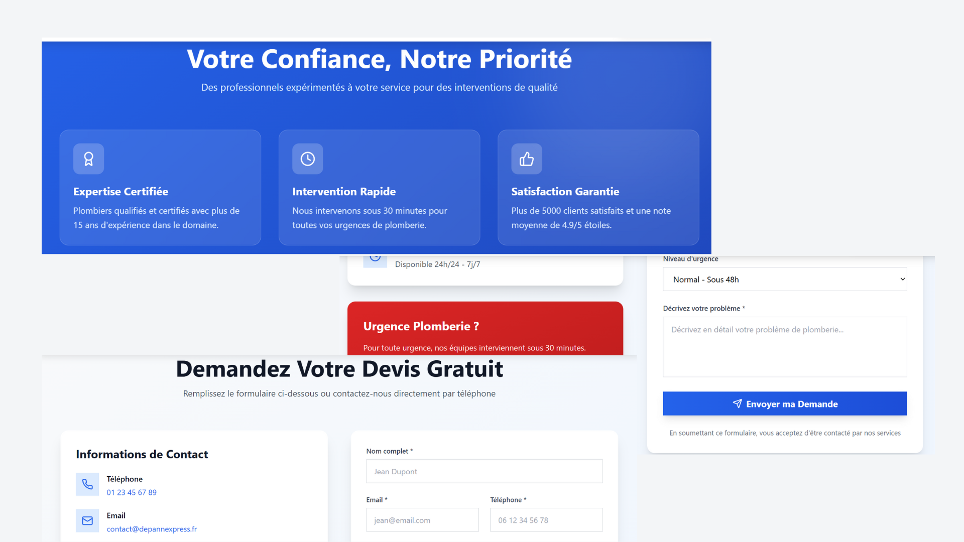Boutons d'Action : Appel direct, lien WhatsApp et formulaire de contact pour générer des devis.