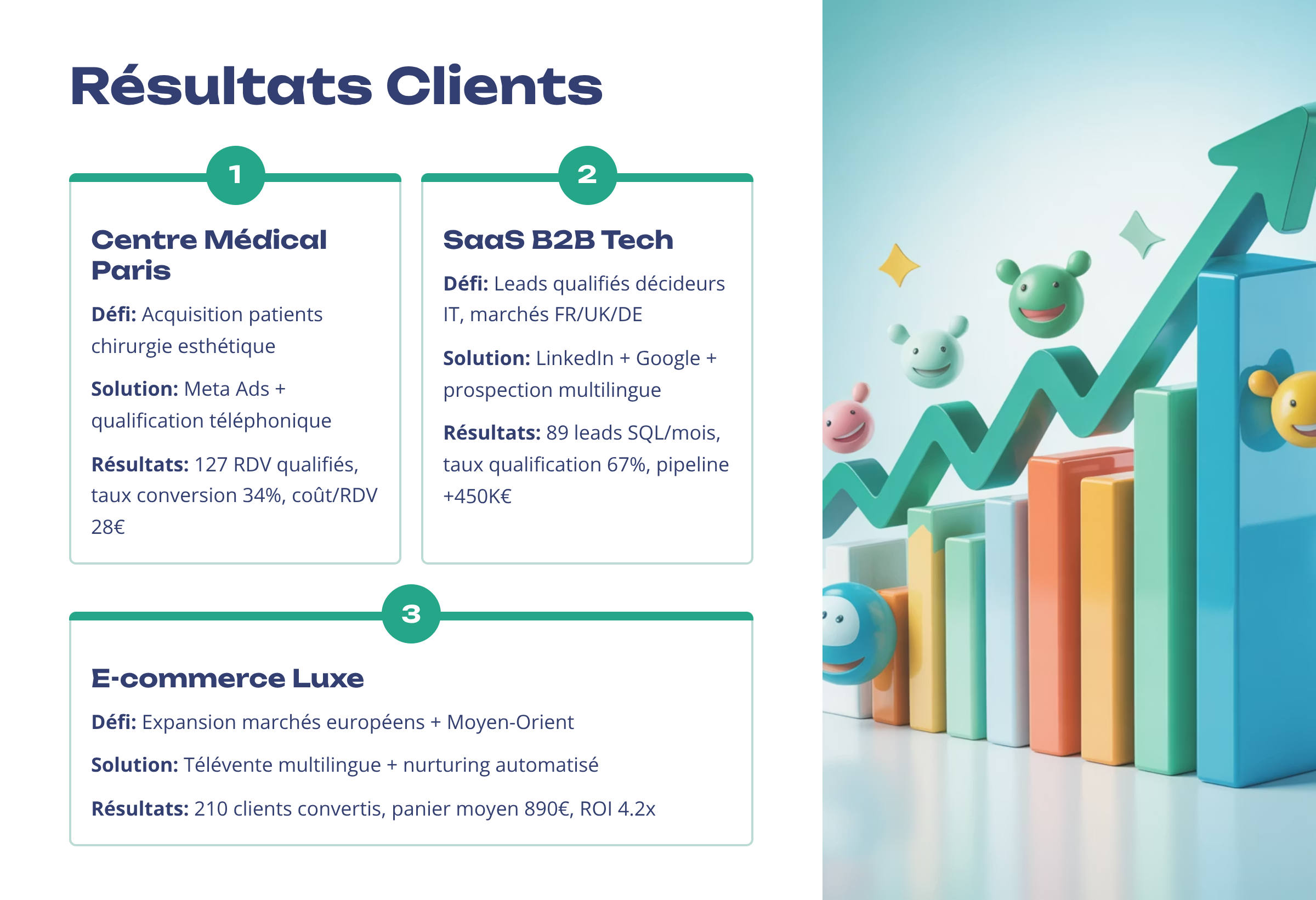 Nos services : • Campagnes Meta & Google ultra-performantes • Génération et nurturing de leads • Cold calling & prise de rendez-vous • Service client & support multilingue • Télévente, qualification & suivi commercial • Gestion complète du cycle d’acquisition