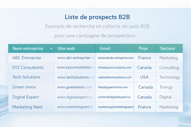 🔹 Ce que vous obtenez : ✔ Une liste d’entreprises ciblées selon votre secteur et votre marché ✔ Des emails professionnels pertinents et exploitables ✔ Un fichier clair, organisé et prêt à être utilisé immédiatement ✔ Une base solide pour lancer ou améliorer vos campagnes d’emailing