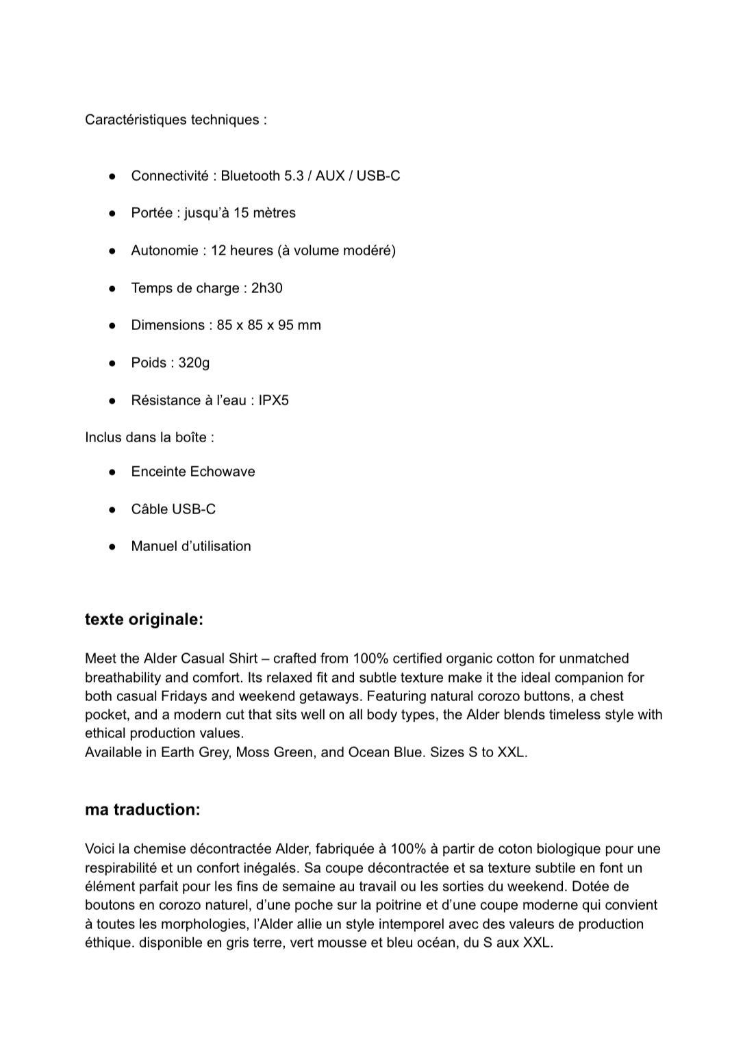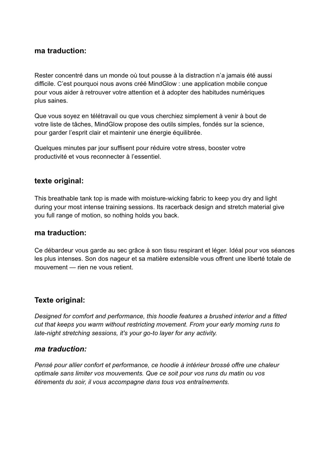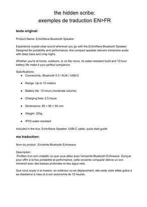 🔹 Traduction FR → EN Je traduis vos textes vers un anglais clair, fluide et professionnel, sans calques du français. → Adapté aux contextes pro, aux présentations, ou aux contenus à destination d’un public anglophone.