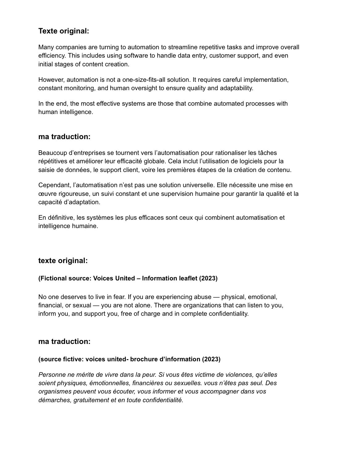 🔹 Traduction EN → FR Je traduis vos documents de l’anglais vers le français en respectant le sens, le ton et les nuances. → Traduction fluide, naturelle et fidèle, que ce soit pour du contenu marketing, administratif ou narratif.