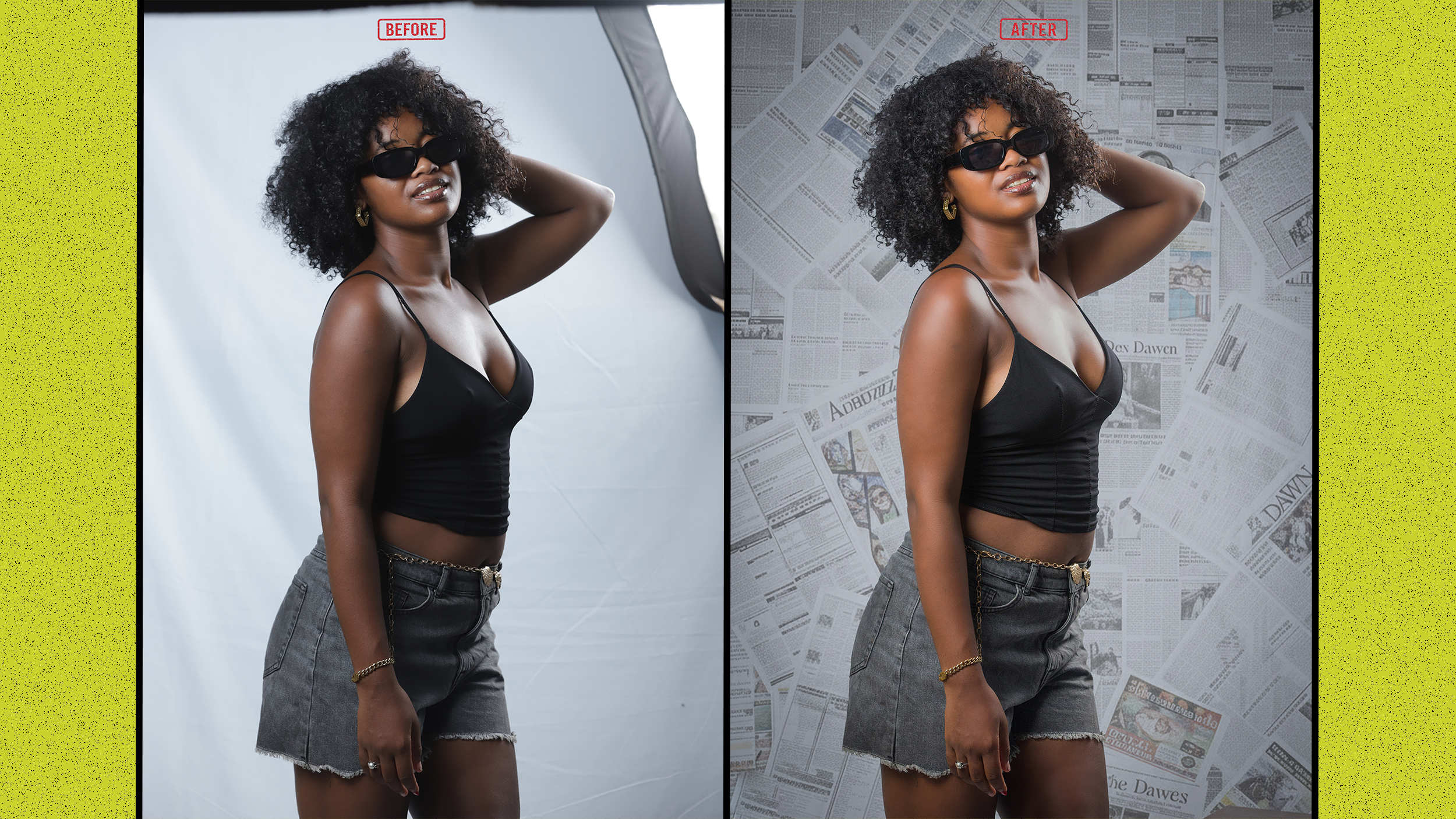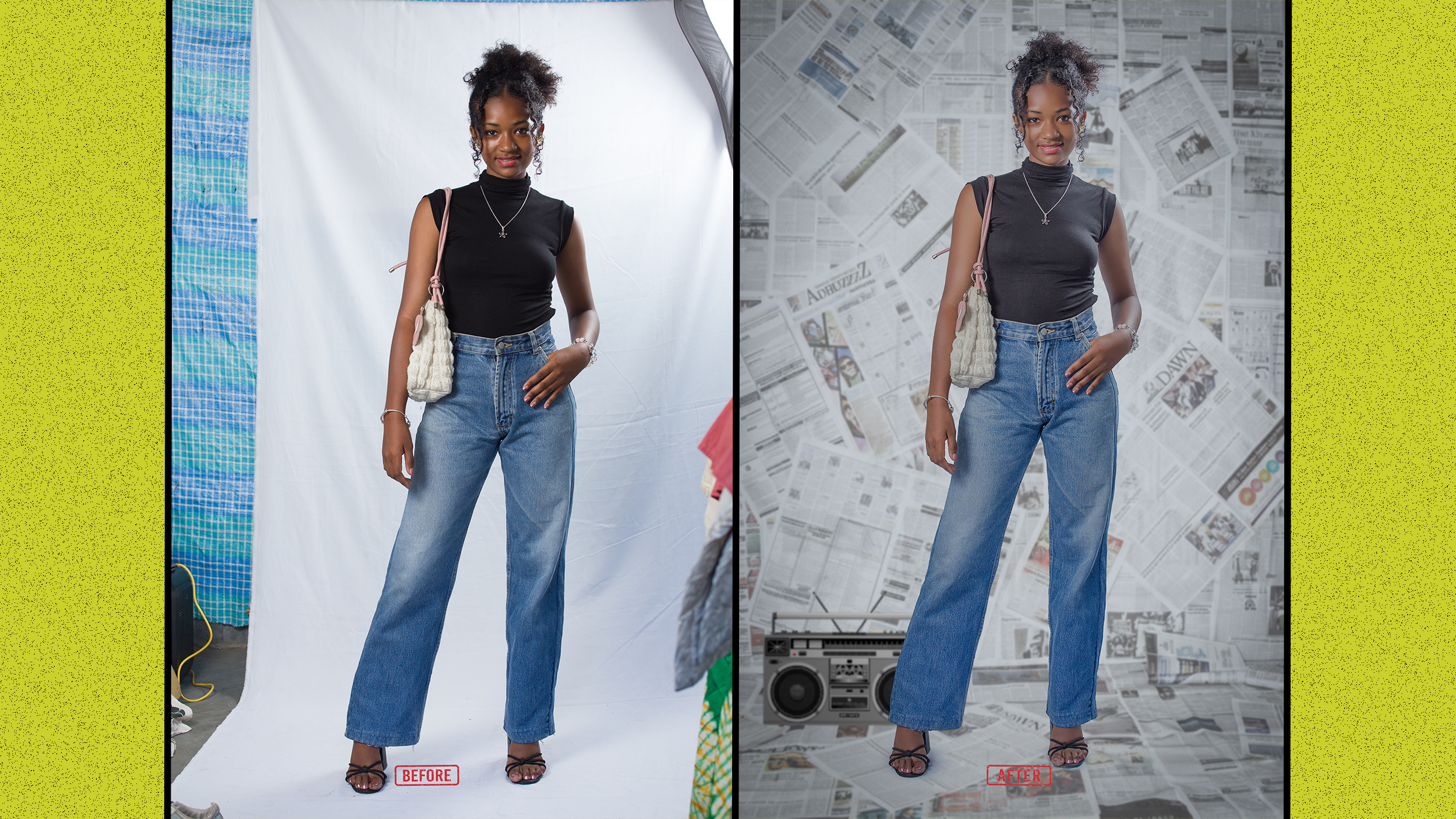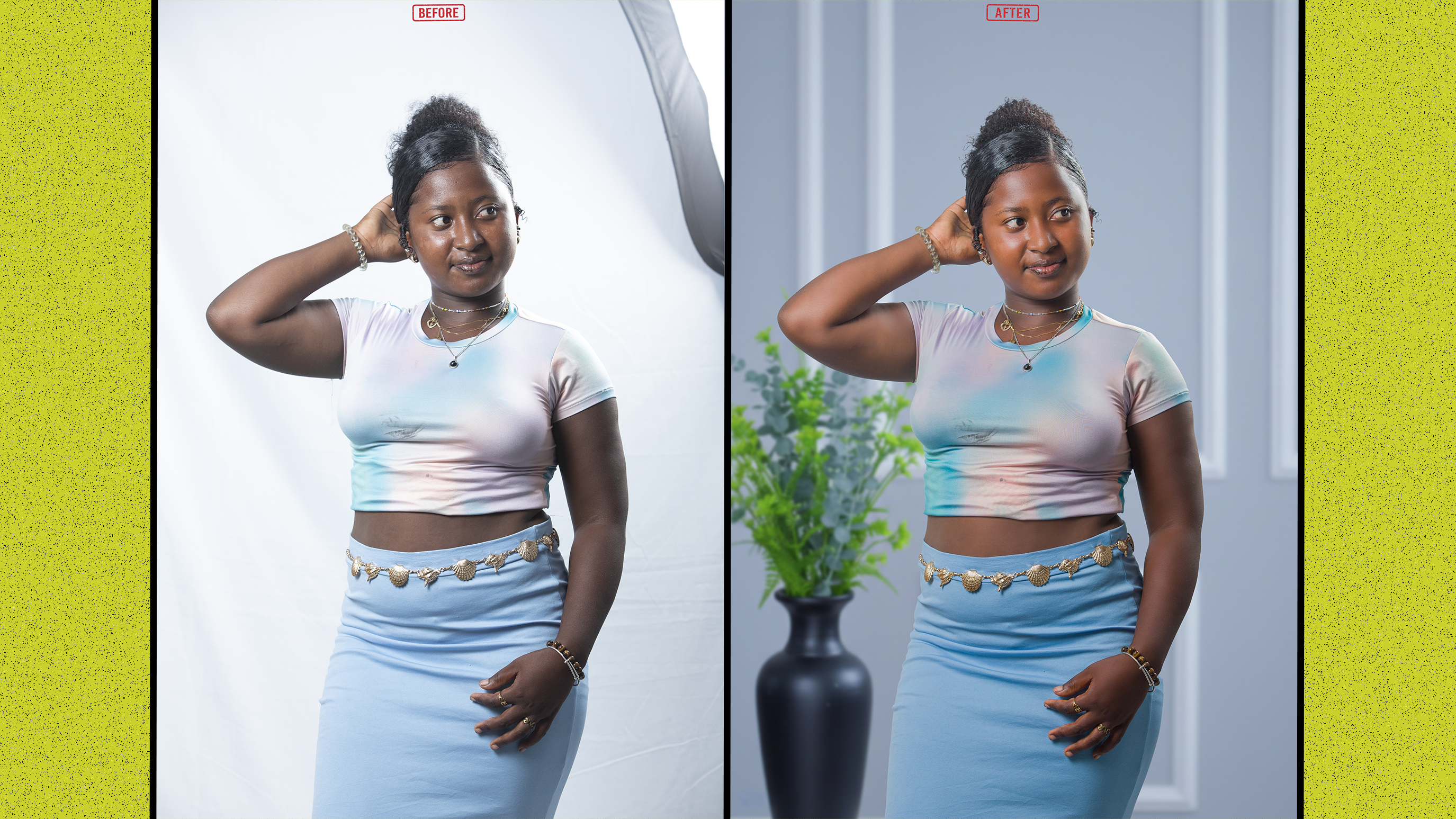 Nettoyage d'arrière-plan (suppression d'objets gênants, poussières, plis sur les vêtements).