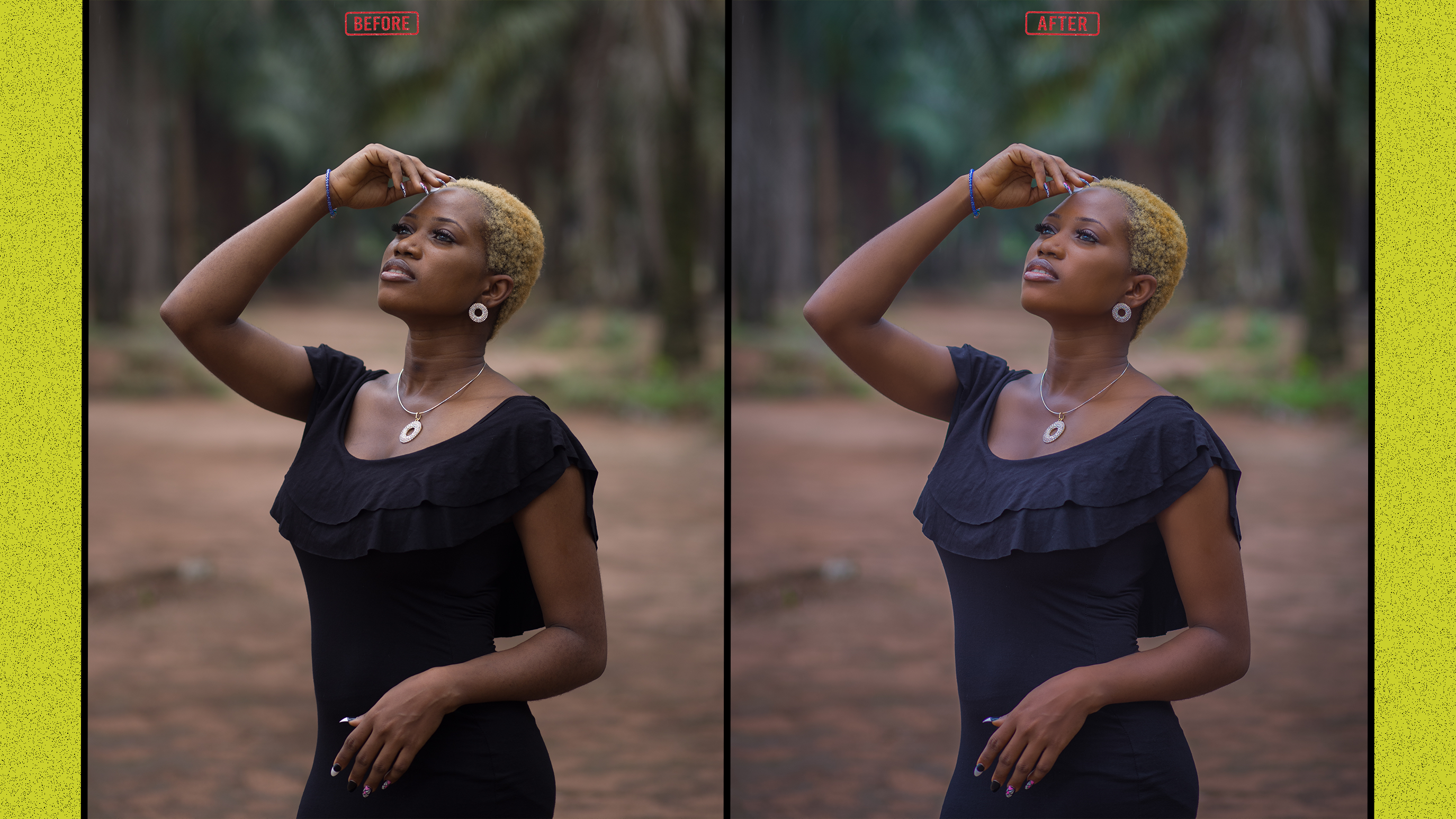 Correction des cheveux et des yeux : Harmonisation de la chevelure et intensification du regard pour un impact visuel fort.