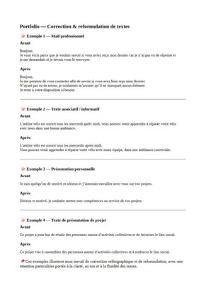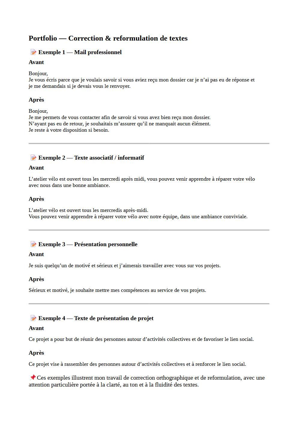 Je corrige et reformule votre texte pour le rendre clair, fluide et agréable à lire. J’élimine les fautes, améliore la structure et adapte le ton à votre objectif. Idéal pour mails, CV, contenus web et documents professionnels.