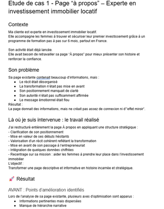 - Rédaction Page “À propos” 800–1200 mots (à partir de 200€) Construction d’un récit stratégique qui met en lumière votre parcours, structure votre différenciation et déclenche la confiance.