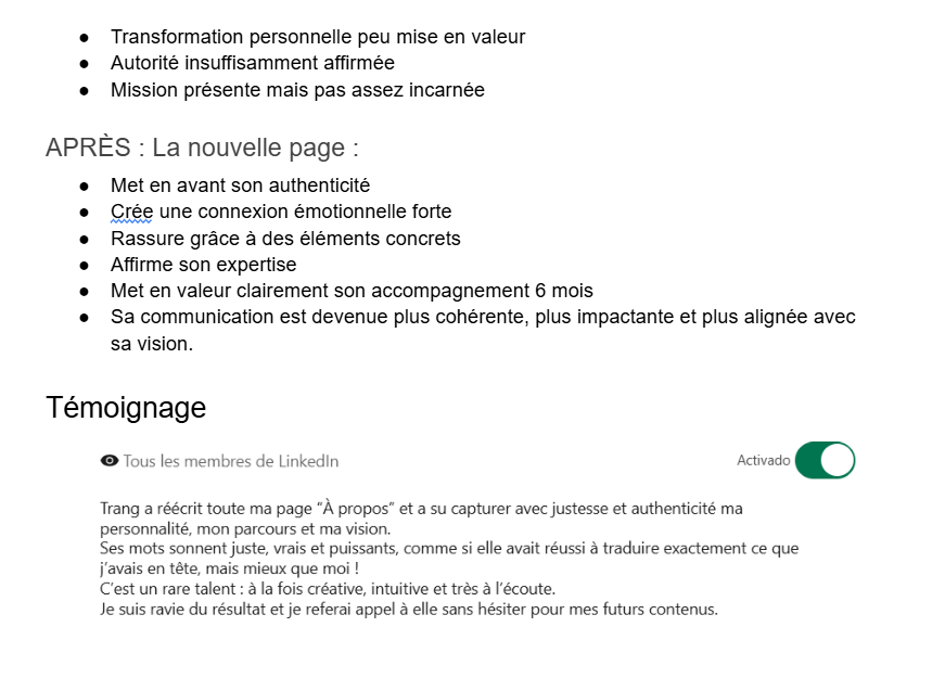 - Adaptation LinkedIn (à partir de 130€) Transformation de votre profil en véritable page de vente : titre stratégique, section "Infos" narrative, promesse forte, mise en avant de la transformation et appel à l’action stratégique.