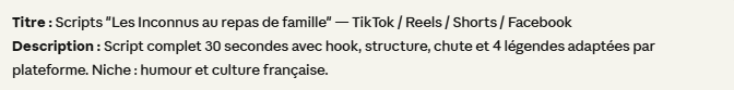 Créateur de contenu spécialisé humour et culture française, j'utilise l'intelligence artificielle pour produire des scripts vidéo courts formats percutants et adaptés à chaque plateforme (TikTok, Reels, YouTube Shorts, Facebook). Je livre des scripts prêts à tourner : hook d'accroche, structure narrative, chute et légende optimisée pour l'algorithme — le tout en 48h. Mes contenus ciblent l'audience francophone avec des références culturelles précises : films cultes, sketchs emblématiques, humour générationnel.