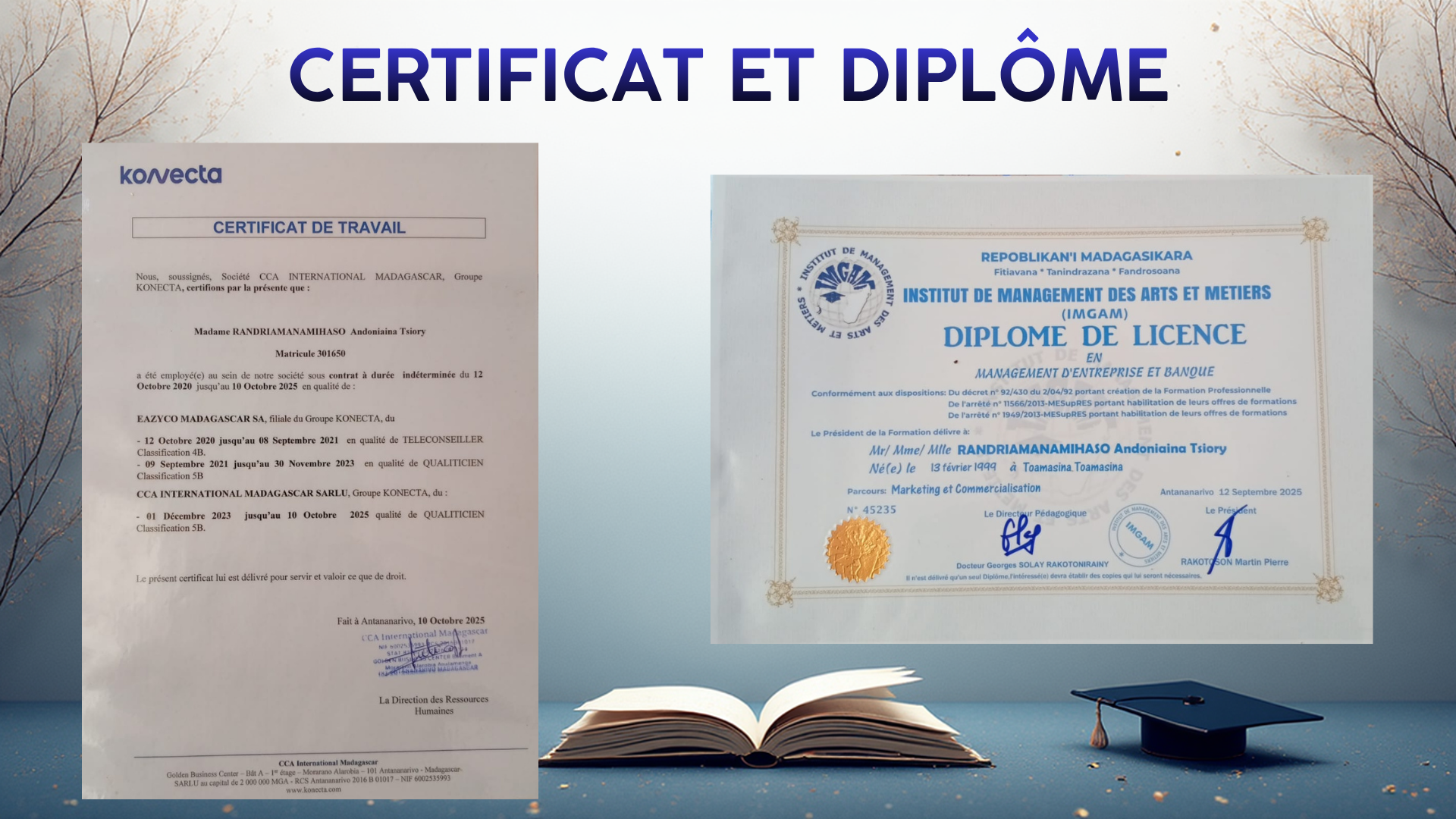 - Diplôme de Licence en Management d'entreprise IMGAM (Institut de Management des Arts et Métiers) ‐ oct. 2025