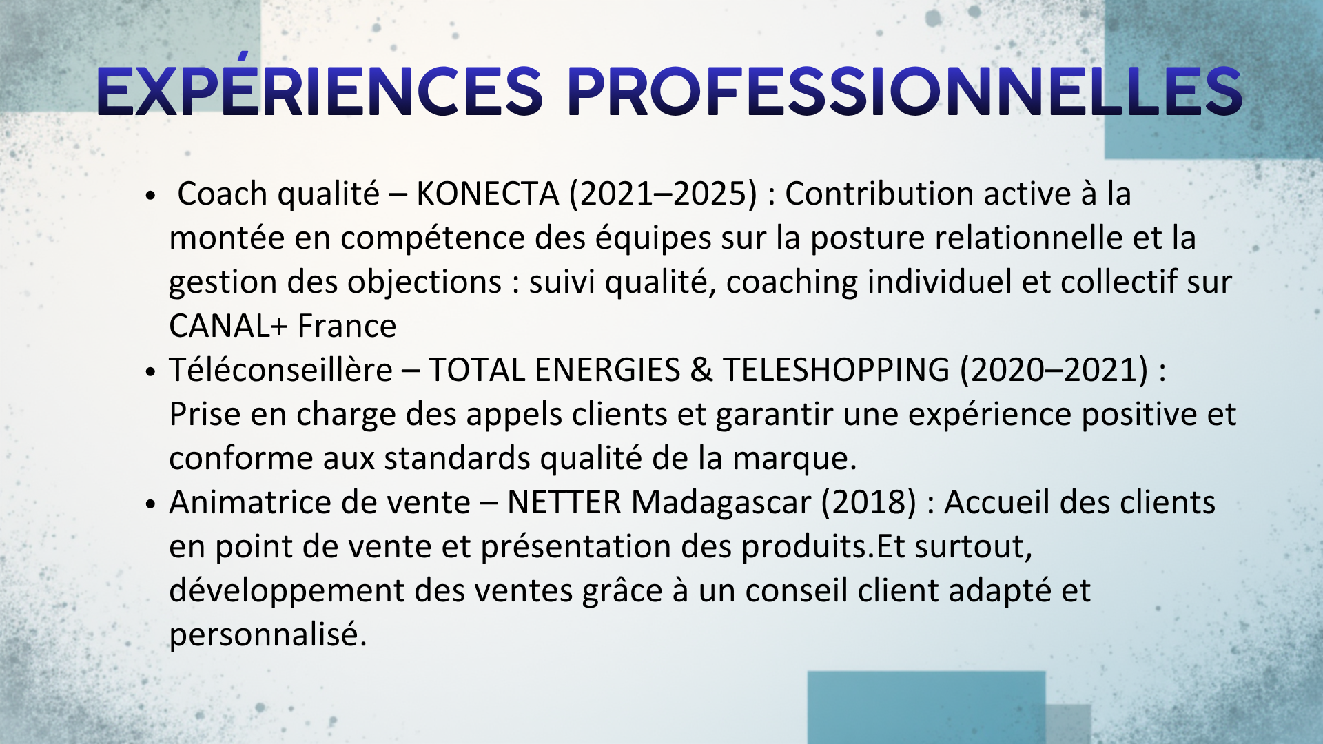 Je suis Ando, professionnelle expérimentée en service client, service après-vente et management d’équipe.