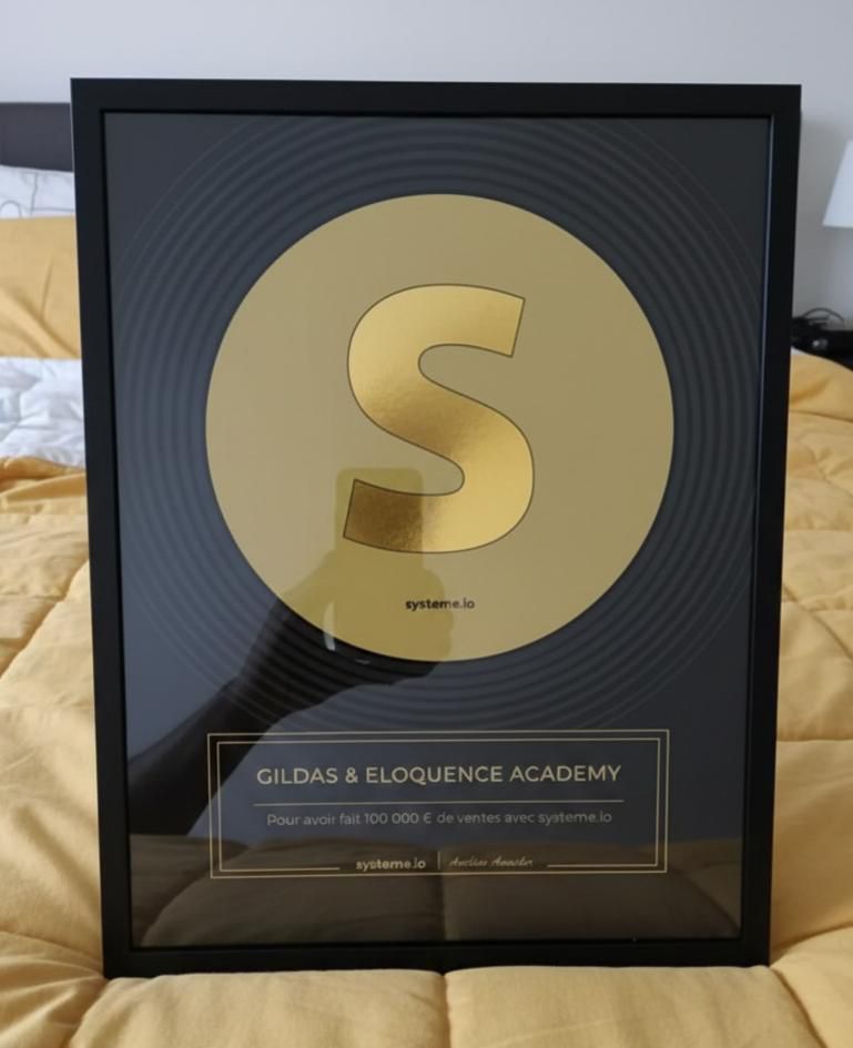 Je suis heureux de vous annoncer que j'ai reçu officiellement le trophée OR décerné par Systeme.io pour avoir généré 100 000 € de chiffre d'affaires avec notre client Nadège à la tête de l’académie ELOQUENCE ACADEMY.
