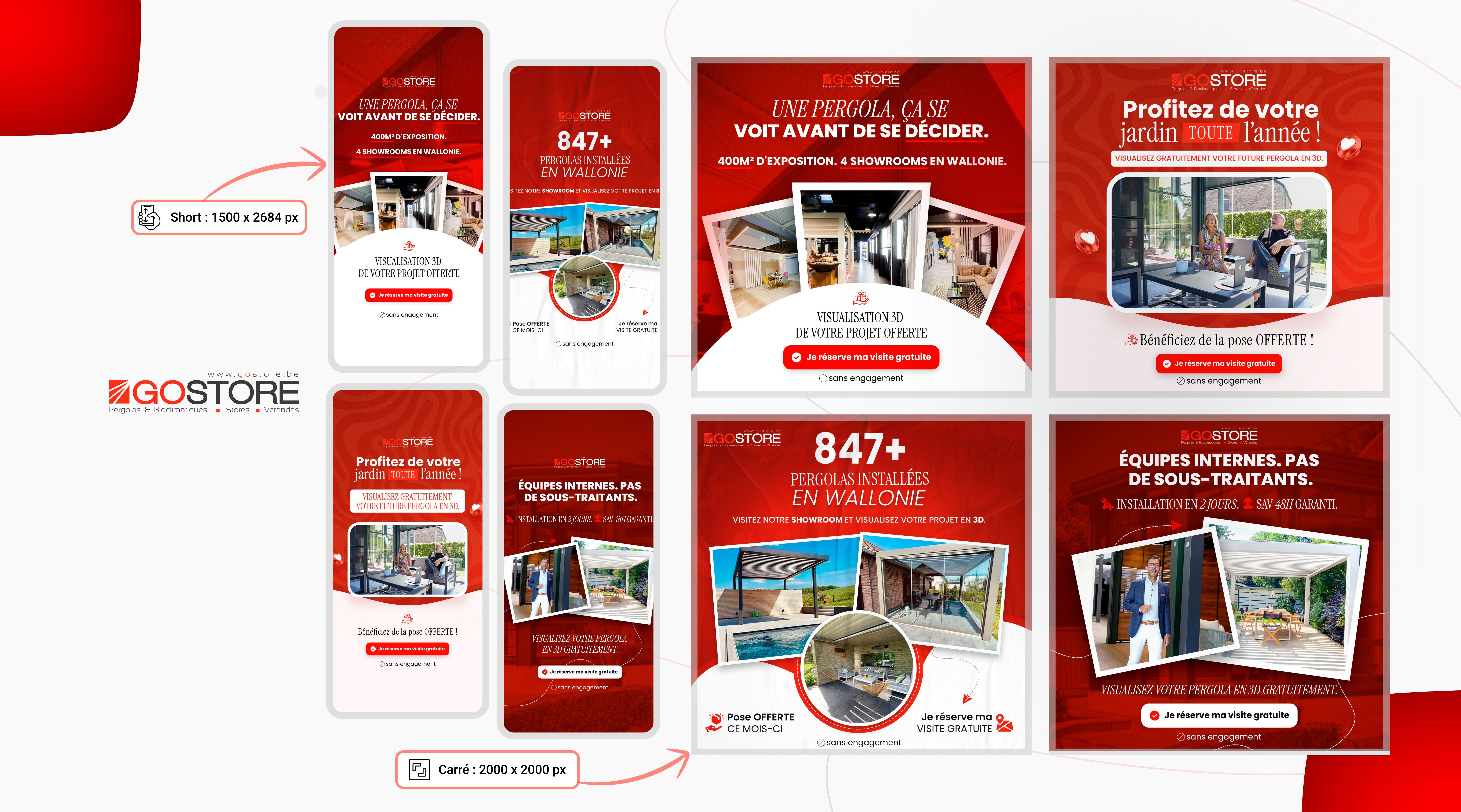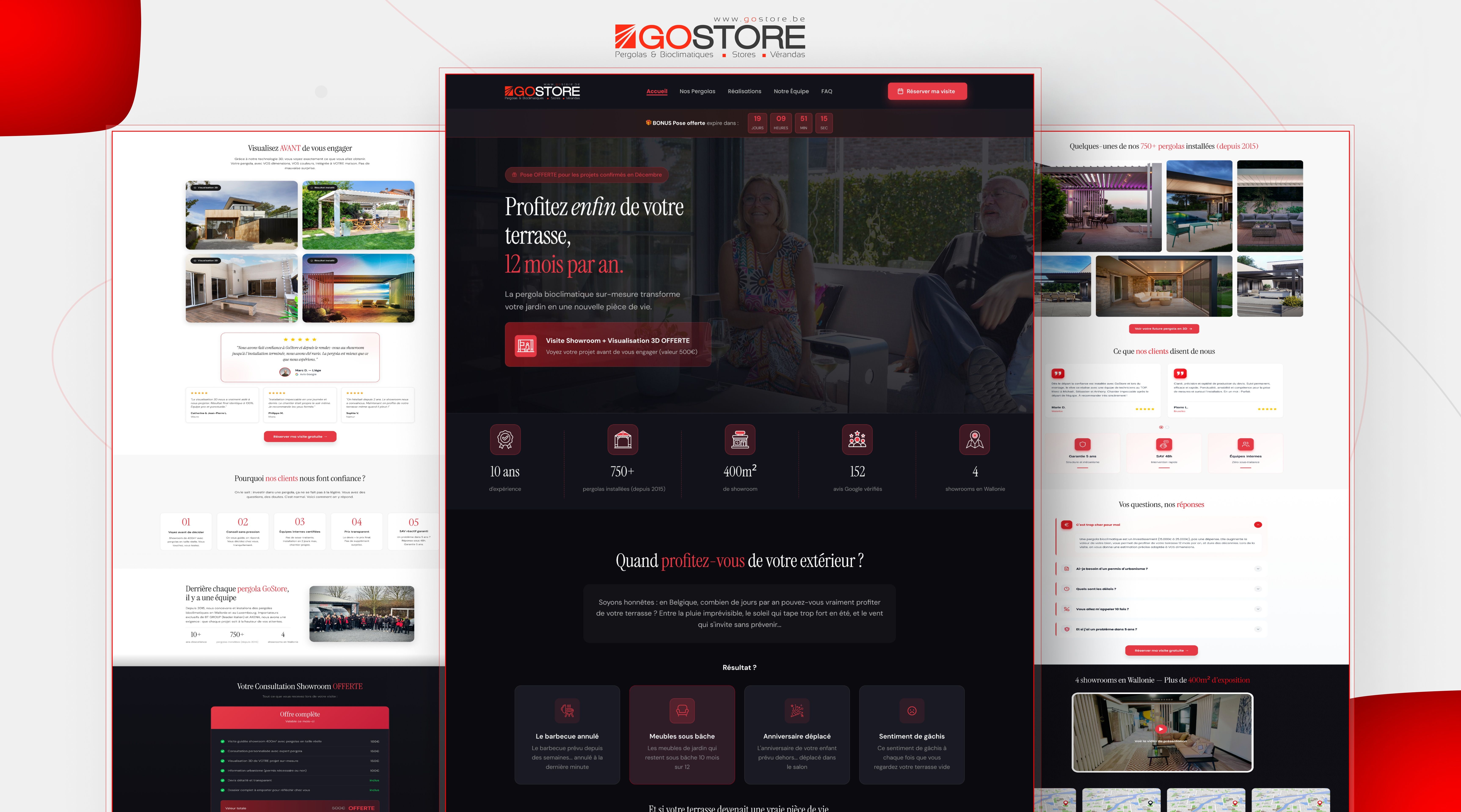 GoStore est un installateur de pergolas, stores et vérandas en Wallonie. Cette landing page a été conçue pour convertir les visiteurs en prospects qualifiés, en mettant en avant leur expertise locale et leur offre sans engagement.