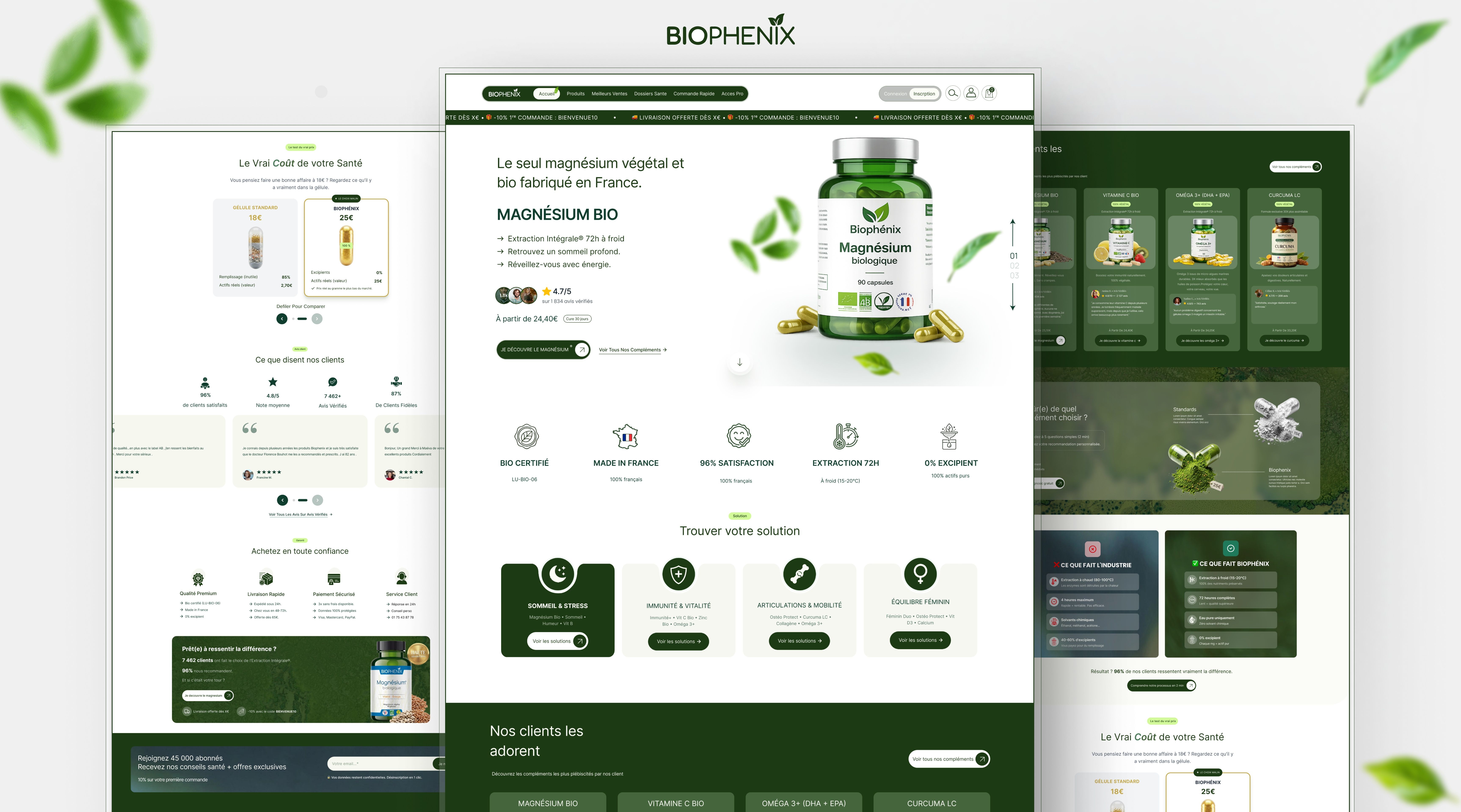 Biophénix est une marque française de compléments alimentaires bio, fabriqués par extraction à froid. Ce site e-commerce a été conçu pour valoriser la qualité premium des produits et convertir des visiteurs sceptiques en clients fidèles.