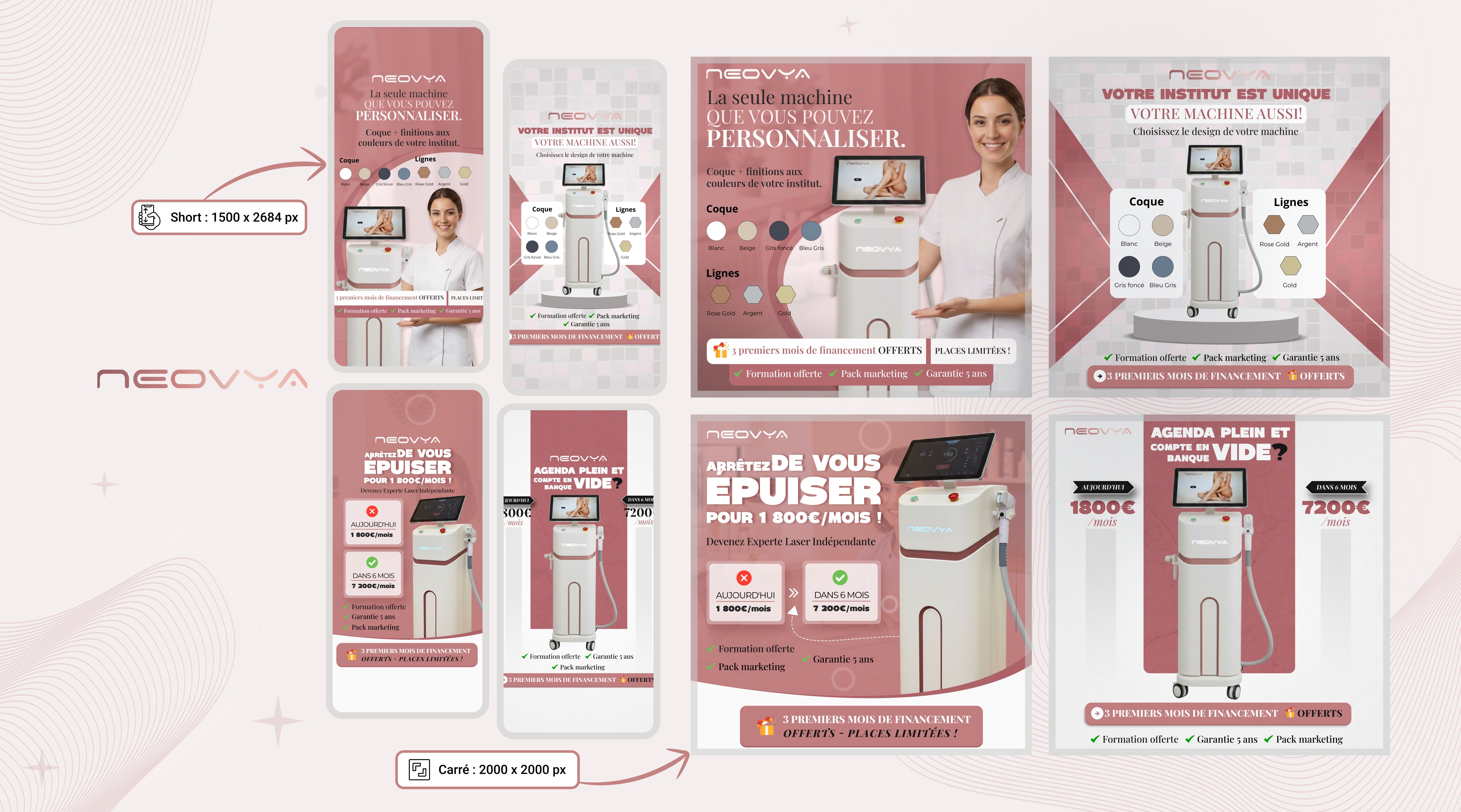 Conception de visuels publicitaires professionnels pour les réseaux sociaux, déclinés en formats Short (1500x2684 px) et Carré (2000x2000 px), adaptés aux campagnes Meta Ads et à la communication organique.