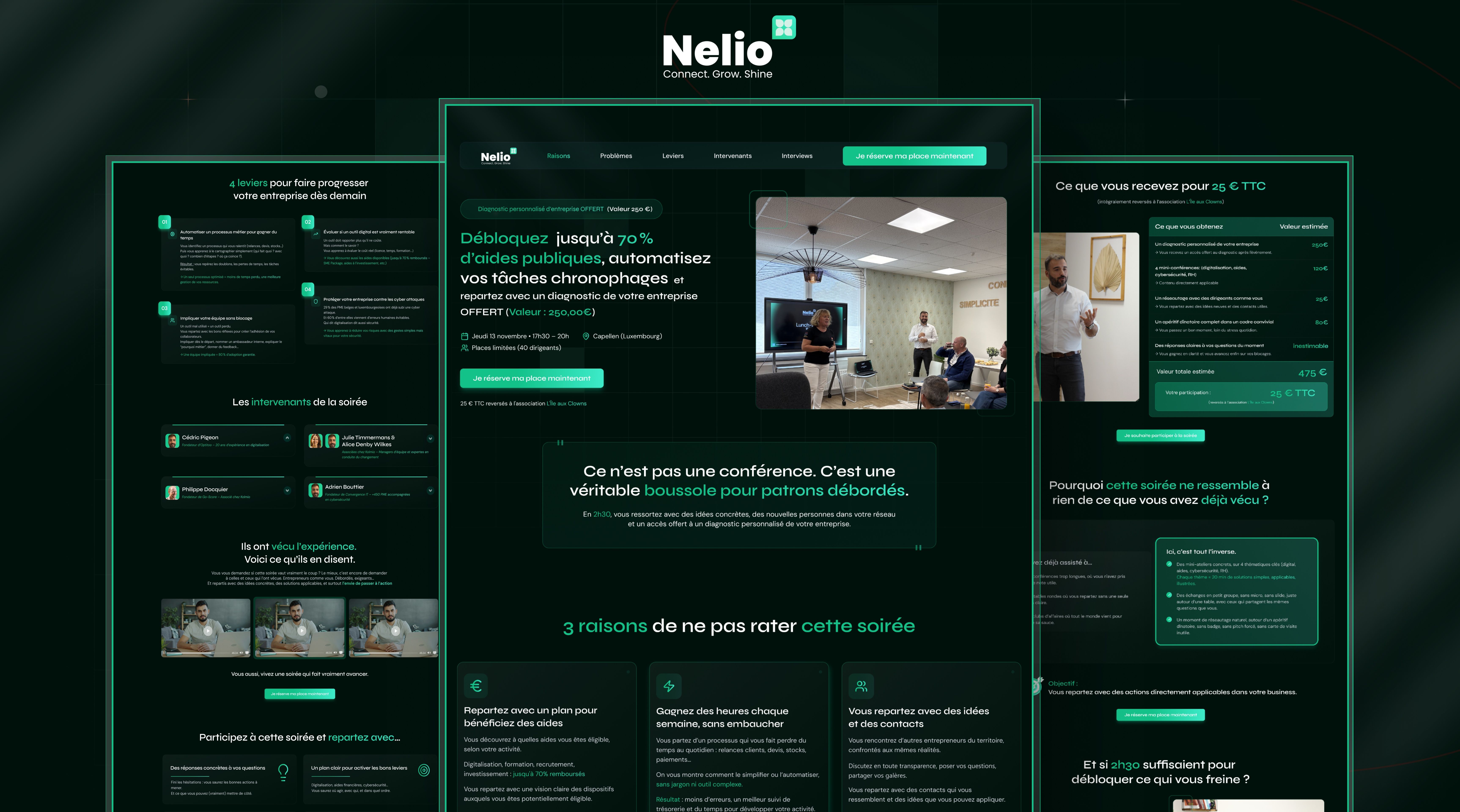 Nelio accompagne les dirigeants d'entreprise. Cette landing page a été conçue pour maximiser les inscriptions à leur soirée conférence, en valorisant l'événement et en levant toutes les hésitations.