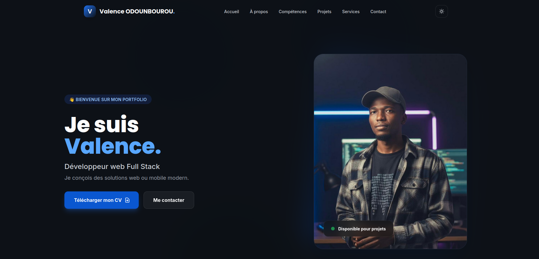Hello ! Moi c’est Valence, développeur passionné, spécialisé dans la création de sites web modernes, applications mobiles et API professionnelles. Je transforme vos idées en solutions fiables, performantes et évolutives.